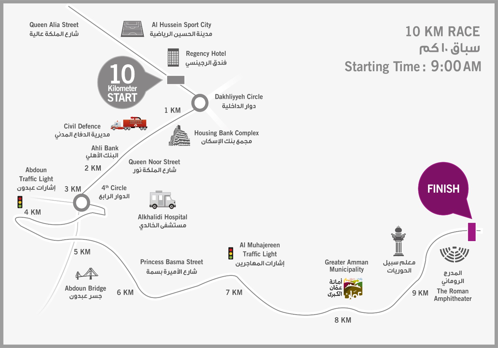 وبيّنت الجمعية أنه سيتم إغلاق الطريق الممتد من مجمع رغدان الجديد مروراً بشارع الجيش باتجاهيْه، والساحة الهاشمية وشارع قريش وشارع علي بن أبي طالب وصولاً إلى إشارات المهاجرين، مروراً بشارع عمر مطر وشارع الملك طلال وشارع الهاشمي، وذلك اعتباراً من الساعة الثانية عشرة بعد منتصف الليل وحتى الساعة الثانية عشرة ظهراً، ضمن مسار سباقي الـ 42 كم (الفردي/التتابع) و21 كم.