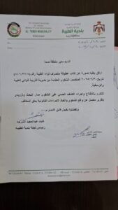 من جانبه، وجه متصرف لواء الطيبة أيمن الرومي بني خالد كتابًا إلى رئيس لجنة بلدية الطيبة، طالب فيه الكوادر البلدية بالكشف الميداني على الحظائر الموجودة قرب إحدى مدارس زبدة الوسطية، نظرًا لانبعاث الروائح الكريهة وظهور الحشرات الزاحفة والطائرة منها، ما يشكل خطرًا على صحة وسلامة المواطنين.