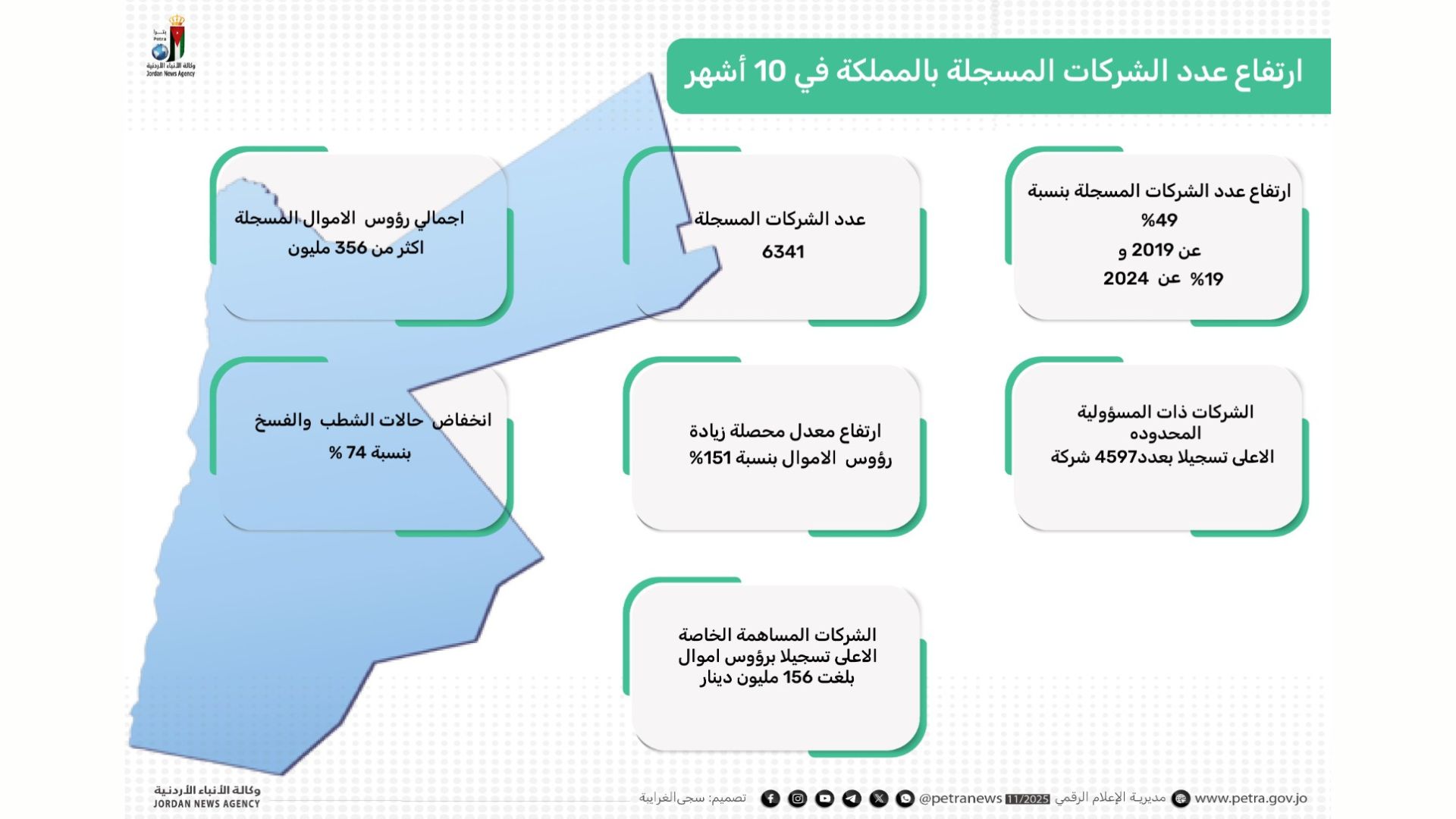 وحسب أرقام إحصائية لدائرة مراقبة الشركات، بلغ مجموع رؤوس الأموال المسجلة خلال الأشهر العشرة الماضية من العام الحالي 2025، ما يزيد على 356 مليون دينار.