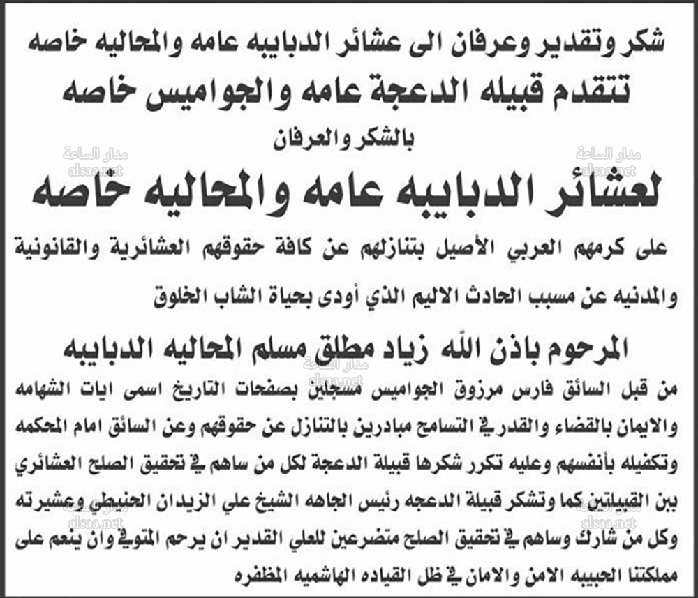 تقدمت عشائر الدعجة بالشكر والعرفان لعشائر الدبايبة عامة والجومايس خاصة ، على كرمهم العربي الاصيل بتنازلهم عن كافة حقوقهم العشائرية عن مسبب الحادث الاليم الذي اودى بحاية الشاب زياد مطلق الدبايبة.