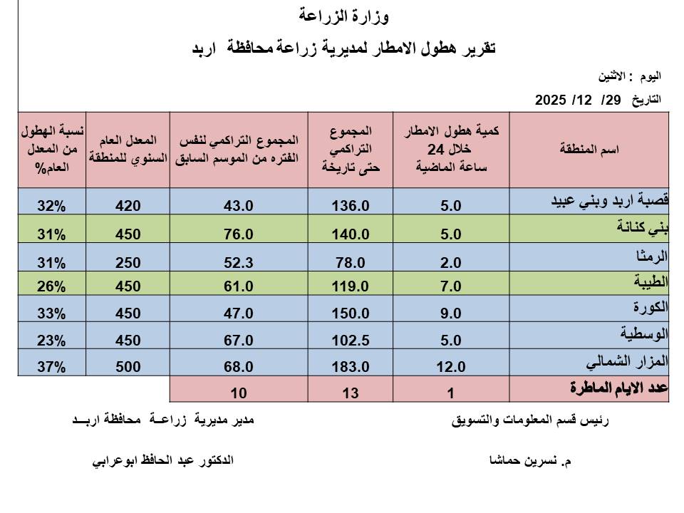 كشف تقرير صادر عن وزارة الزراعة / مديرية زراعة محافظة إربد أن لواء المزار الشمالي سجل أعلى نسبة هطول مطري في المحافظة خلال الموسم المطري الحالي، حيث بلغت كمية الأمطار المسجلة (183) ملم، مقارنة بنسبة (37%) من المعدل العام في الفترة نفسها من الموسم الماضي.