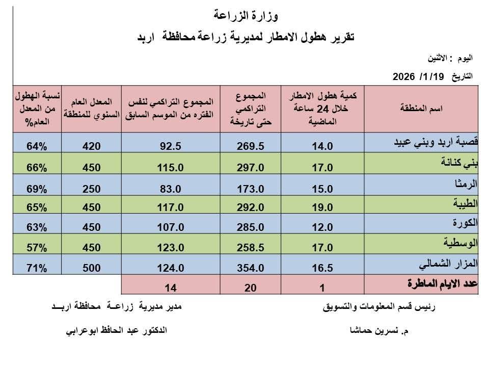 وأشار التقرير إلى كميات الهطول خلال الأربع والعشرين ساعة الماضية في ألوية محافظة إربد، حيث سجلت القصبة وبني عبيد 14 ملم، وبني كنانة 27 ملم، والرمثا 15 ملم، والطيبة 19 ملم (الأعلى وفق ما ورد)، والكورة 12 ملم، والوسطية 17 ملم، فيما لم يرد رقم لواء المزار الشمالي في نهاية القائمة بالنص المتاح.