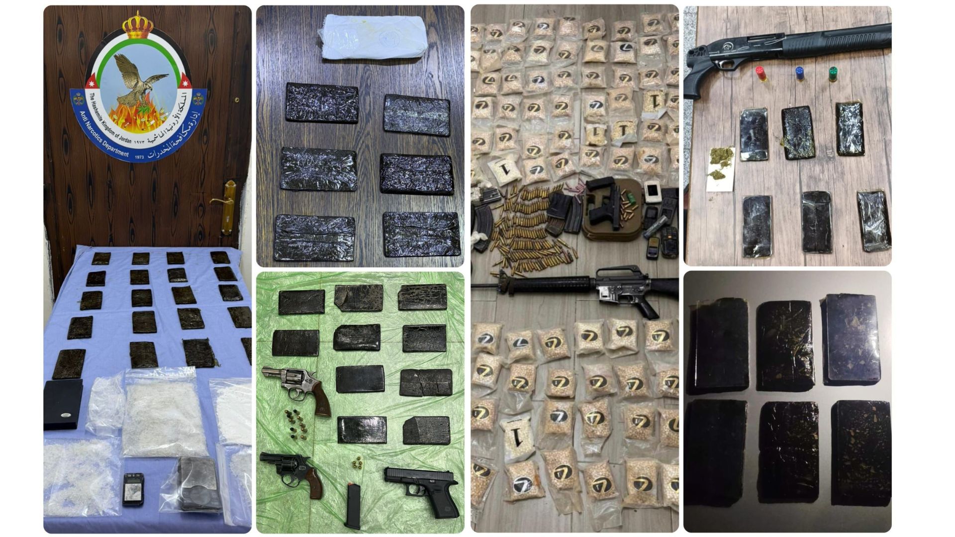وأوضح الناطق الإعلامي تفاصيل القضيتين المرتبطتين بعصابات إقليمية، حيث كانت الأولى ضمن اختصاص لواء الرويشد حيث قام فريق تحقيقي خاص بمتابعة ومراقبة أحد الأشخاص المشتبه بهم بالتعامل مع عصابات إقليمية للتهريب وتجارة المخدرات، وبعد التأكد من كافة المعلومات وحيازة ذلك الشخص لكميات كبيرة من المخدرات ومكان إخفائه لها جرت مداهمته وإلقاء القبض عليه، وضبط بحوزته 120 ألف حبة مخدرة وسلاحان ناريان وأجهزة خاصة لتحديد المواقع والتواصل مع العصابات الإقليمية.
