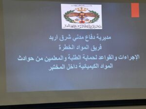 افتتحت مديرة التربية والتعليم للواء بني كنانة، هدى عبدالله الشطناوي الدورة التدريبية حول السلامة العامة وحوادث المواد الكيميائية في المختبرات المدرسية، والتي تُعقد بالتعاون مع مديرية الأمن العام / مديرية الدفاع المدني / شرق اربد ، وذلك على مسرح مدرسة حريما الثانوية للبنات، وبمشاركة عدد من قيّمي المختبرات المدرسية والمعنيين بالعمل المخبري.
