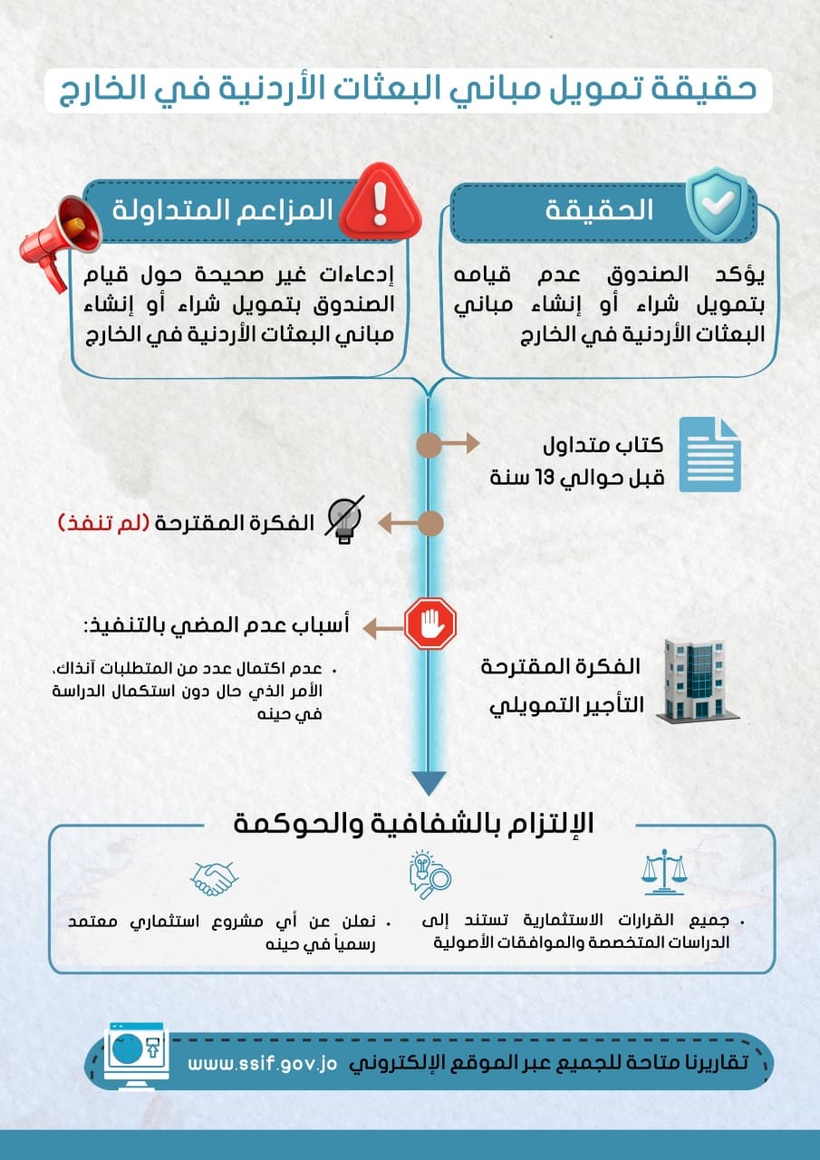 هرمنا ـ نفى صندوق استثمار أموال الضمان الاجتماعي صحة ما يتم تداوله من معلومات ومزاعم بشأن قيامه بتمويل شراء أو إنشاء مباني البعثات الأردنية في الخارج، مؤكدا أن هذه الادعاءات غير صحيحة.