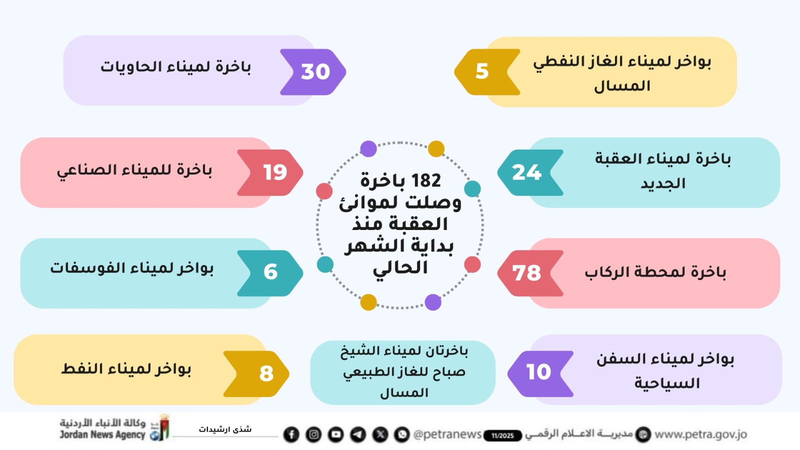 كما وصل لميناء الغاز النفطي المسال 5 وميناء العقبة الجديد 24 وميناء الشيخ صباح للغاز الطبيعي المسال باخرتين ومحطة الركاب 78 وميناء السفن السياحية 10 بواخر.