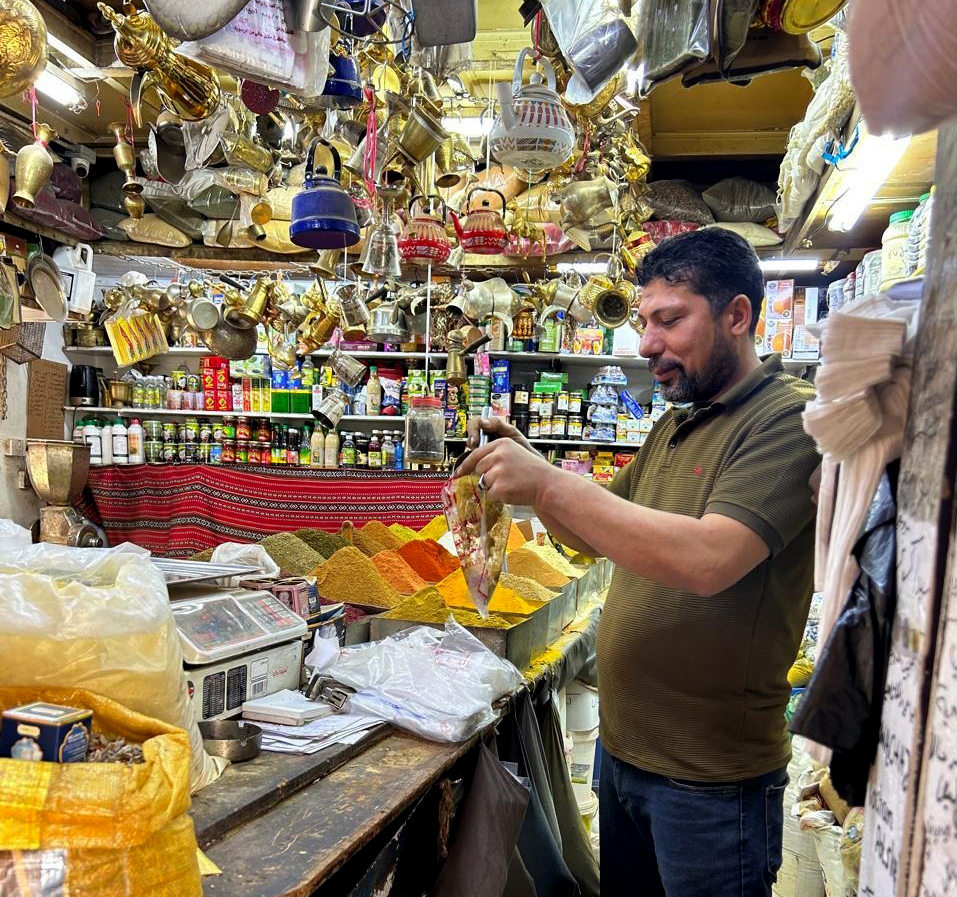 وخلال جولة في أزقة السوق الضيقة، يستقبل الزائر باب السوق القديم الذي يقود إلى عالم من الروائح العطرة المنبعثة من محال العطارة والبهارات، حيث تتراص الأكياس المملوءة بالأعشاب والتوابل، وبعضها ما يزال يحضر ويخلط يدوياً وفق وصفات تقليدية توارثها التجار عن آبائهم وأجدادهم.