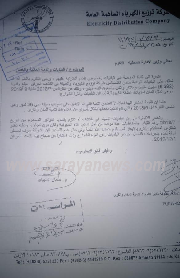 عاجل : فصل التيار الكهربائي عن مرافق بلدية معان الكبرى .. وثيقة