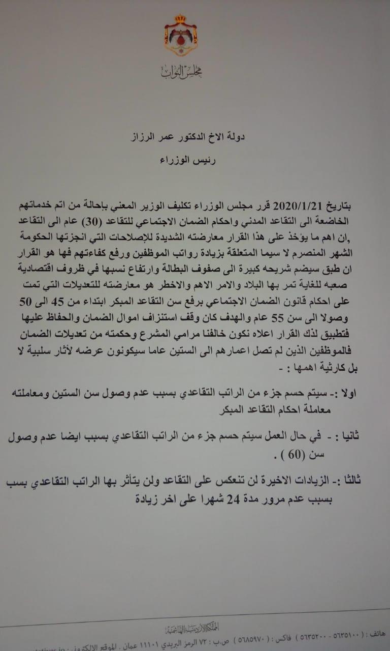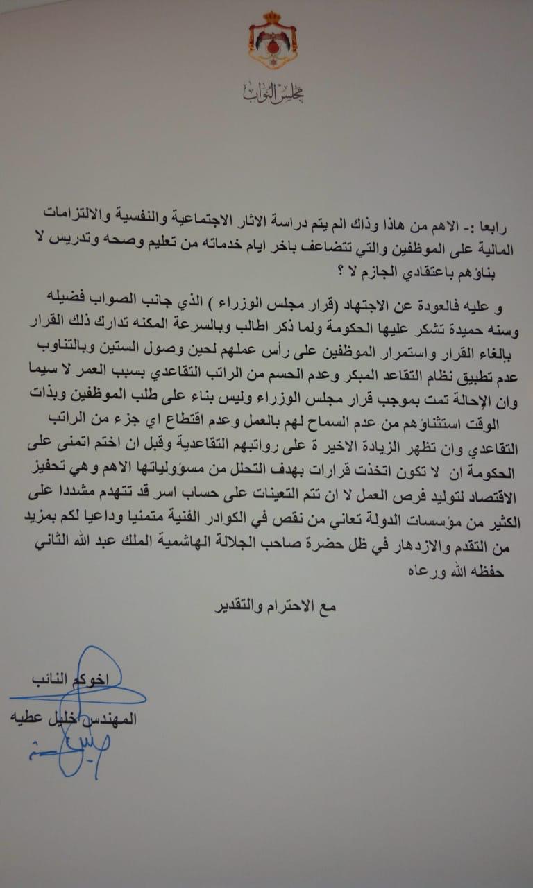 طالب النائب خليل عطية رئيس الوزراء عمر الرزاز بالتراجع عن قرار من اتم 30 عاما في عمله الى التقاعد المدني واحكام الضمان الاجتماعي .