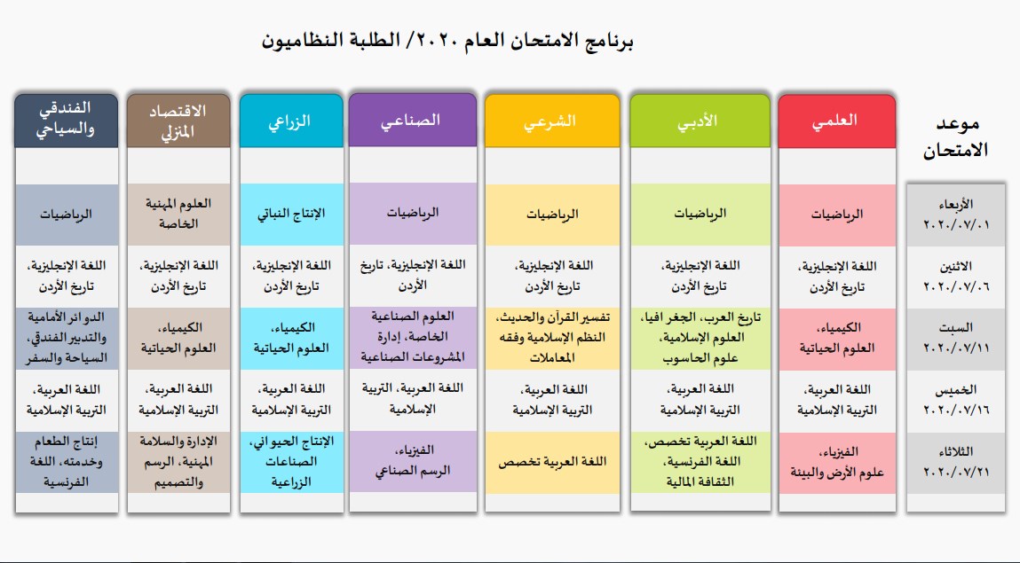 وكالة هرمنا – أعلنت وزارة التربية والتعليم برنامج الامتحان العام لعام ٢٠٢٠ للفروع الأكاديمية والمهنية للطلبة النظاميين وطلبة الدراسة الخاصة، بعد أن أقره مجلس الامتحان اليوم، وسيبدأ الامتحان وفق البرنامج يوم الأربعاء ١ /٧ / ٢٠٢٠ وينتهي يوم الثلاثاء ٢١ /٧ / ٢٠٢٠.