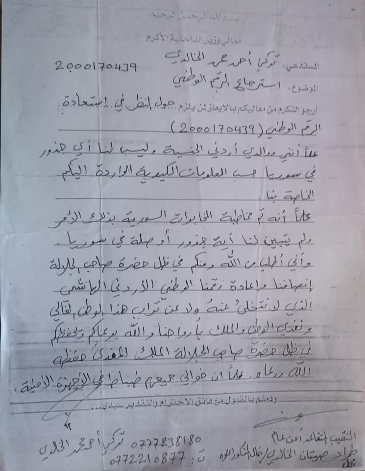 نفس الغايه سيدي المذكورين أعلاه منذ عامين تم سحب ارقامهم الوطنية حيث قمت انا خال المذكور تركي احمد محمد الخالدي بمراجعة جميع الدوائر الحكومية ووزير الداخلية أنذاك غالب باشا الزعبي ومديرية الجوازات والجنسية ورئيس مجلس النواب ومعالي الباشا النائب مازن القاضي ودولة رئيس الوزراء انذاك هاني الملقي ورئيس مجلس الاعيان دولة فيصل الفايز واخبرته بذالك واخذ مني جميع الاوراق حيث اخبرني انه خاطب الجهة المعنية بذالك الأمر الكبير وقمت بتقديم استدعاء رسمي الى معالي وزير الداخلية المرفق في الصورة انذاك واخبروني انه تم مخاطبة الجهات المعنية بذالك الأمر ومنذ عامين ونحن ننتظر الجواب و النتيجة سيدي علمآ انه تم منح اشخاص الجنسية الأردنية عراقيين وسوريين لاجئين ولم يقدموا مثلما قدم البدو الذي يلتحفون السماء منذو اكثر من ٤٠ عام وهم مواطنين أردنيين من محافظة المفرق، بدو من العشائر الأردنية بني خالد.. النعيم… الغياث … الشرفات ..المساعيد… السرديه… اهل الجبل… وغيرهم. عدد قليل طامعين بكرمكم السخي يا مولاي يستحقوا الجنسية الأردنية لحبهم الوطن وتراب الوطن و الهاشميين أعرفهم مواليد الأردن قبل ٤٠ عام ليس معهم اي اثبات اردني او هوية سوى ورقه بيضاء حبرها ارهقته السنين موقعة من شيوخ العشائر الذي وافتهم المنيه ومنهم من عنده بنات لايستطيع تزويجهم او عقد قرانهم رسميآ ( زواجهم على البركه قراية فاتحه) مولاي حضرة صاحب الجلالة نقلت اليكم أوجاع بعض شعبكم الوفي للعرش الهاشمي الذي انتم يا سيدي شعاركم الإنسان اغلى مانملك، سيدي الفئة المذكورة وقفت وتعبت و شاركت في بناء الأردن وتحملت البرد والجوع والعطش في الصحراء القاحلة وهم ينتظرون كرمكم السخي حيث انهم رضعوا حب الوطن والعائلة الهاشمية وليس لهم سوى هذه البلد وقائد البلد الملك عبدالله الثاني بن الحسين باني المستقبل وحامي الحمى وفقكم الله وأطال الله في عمركم سيدي ابنكم المخلص لكم النقيب المتقاعد أمن عام طراد صيتان الخالدي