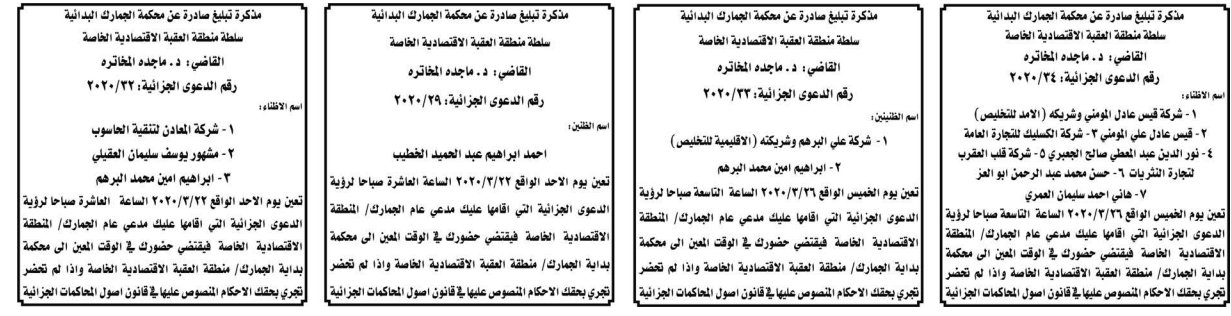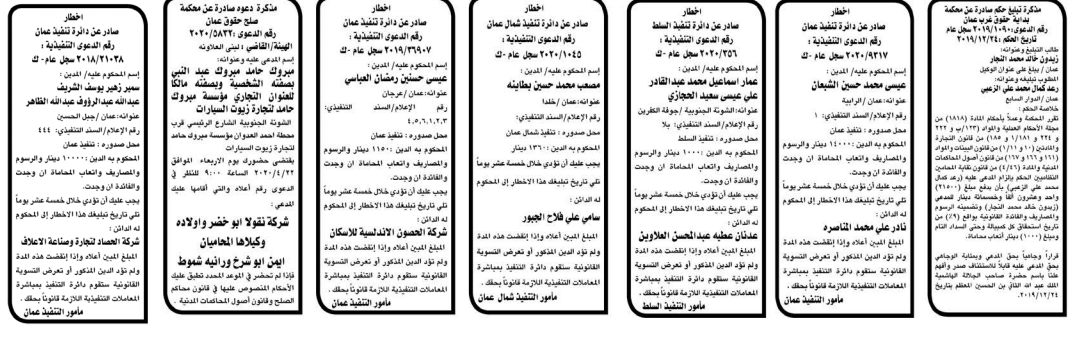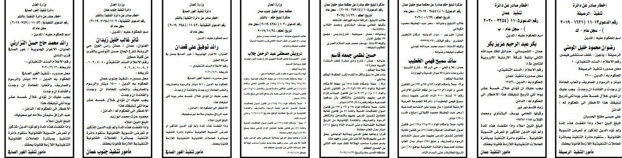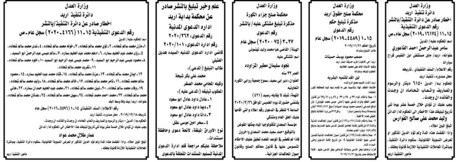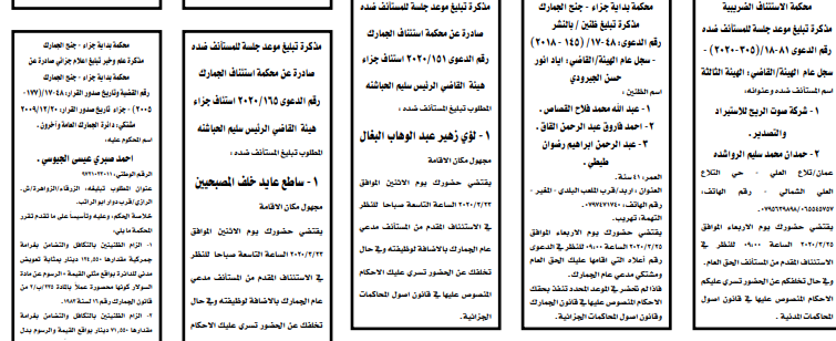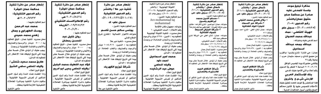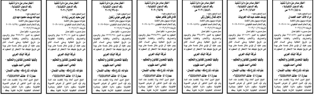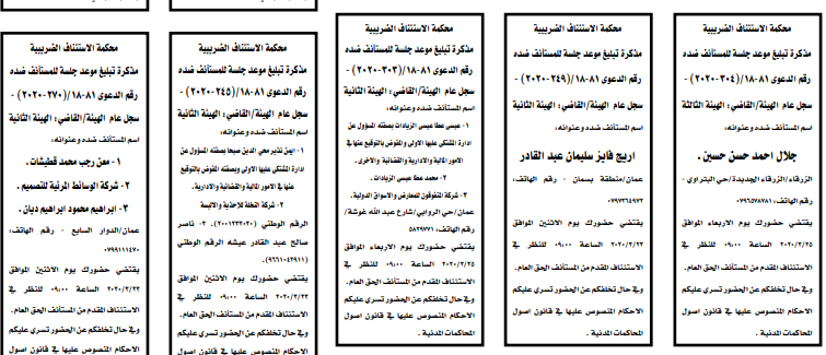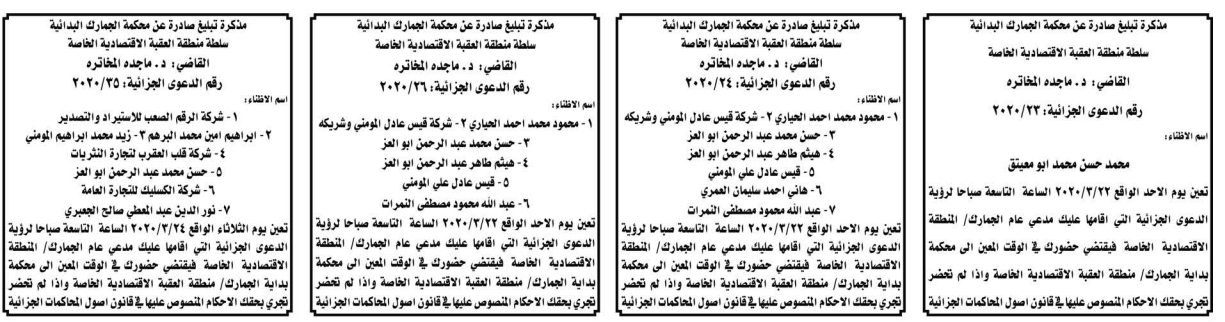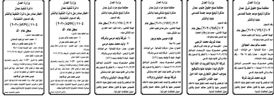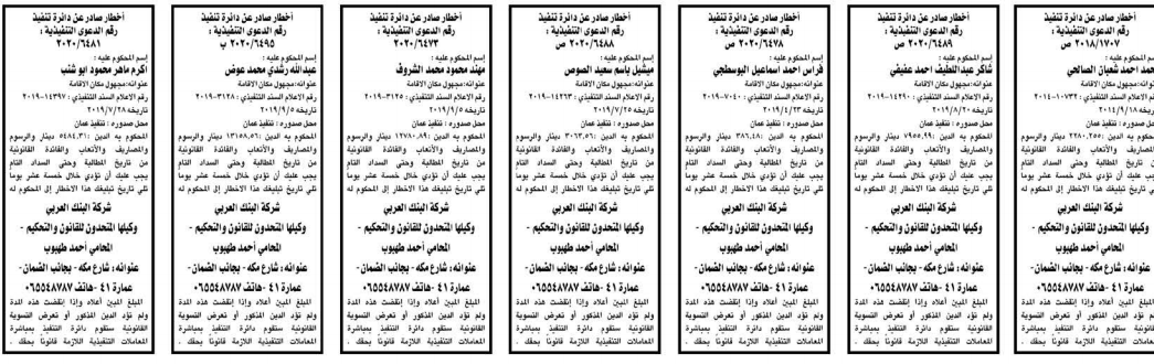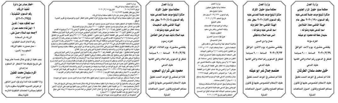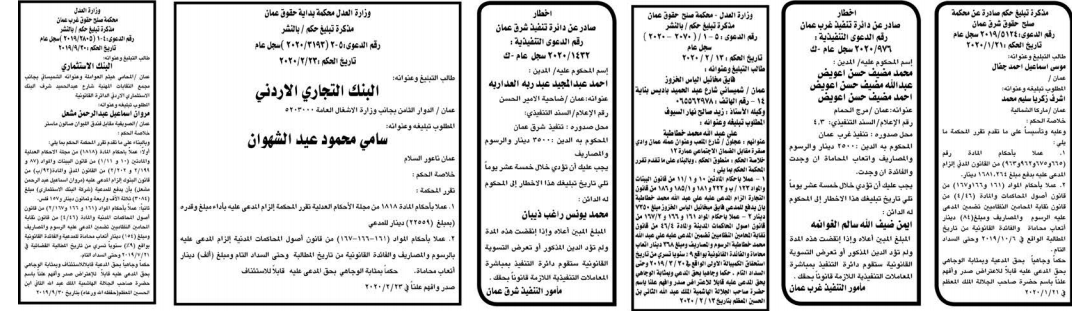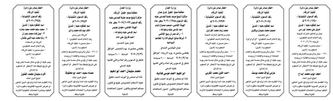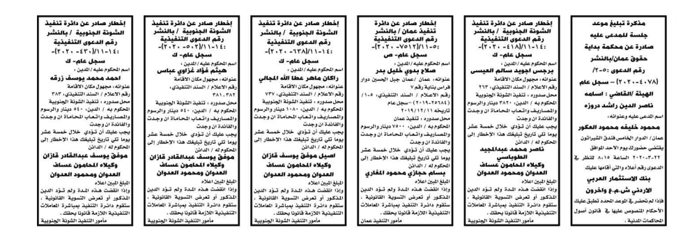 وتضمنت مذكرات بعض الاحكام الصادرة غيابياً إضافة إلى إخطارات وإشعارات صادرة عن دوائر التنفيذ بحق مدعى عليهم أشخاص كانوا أم شركات.
