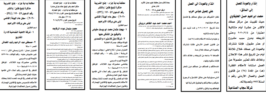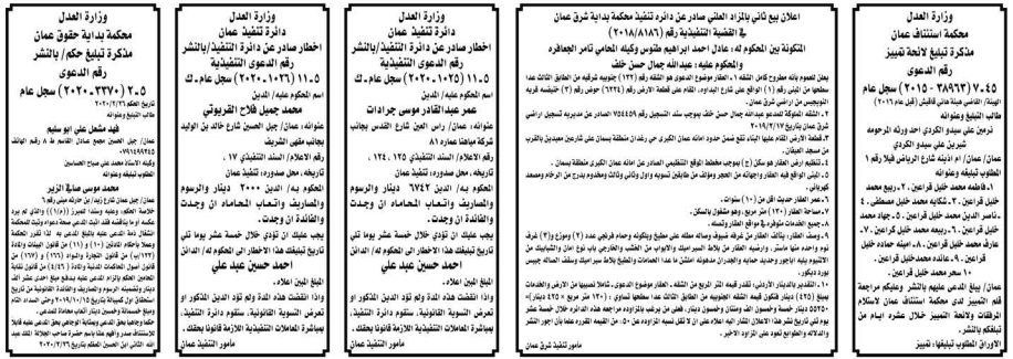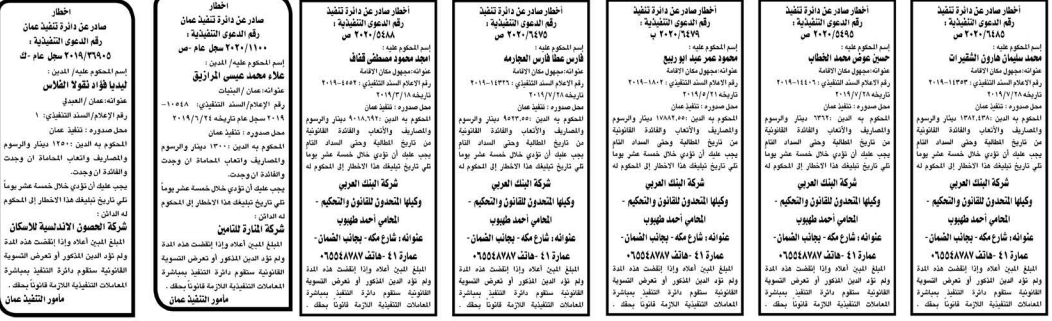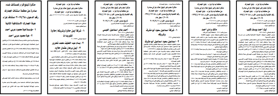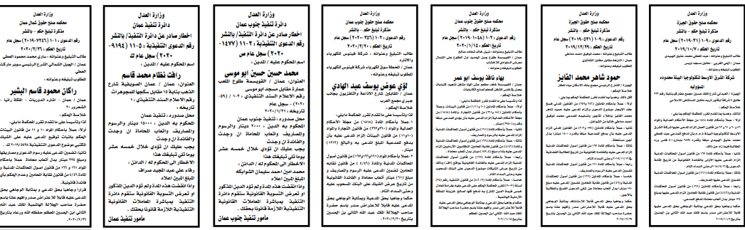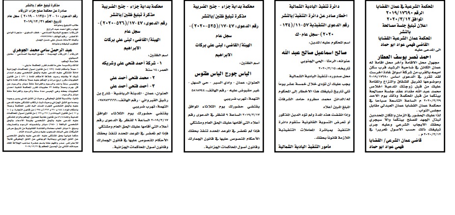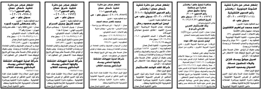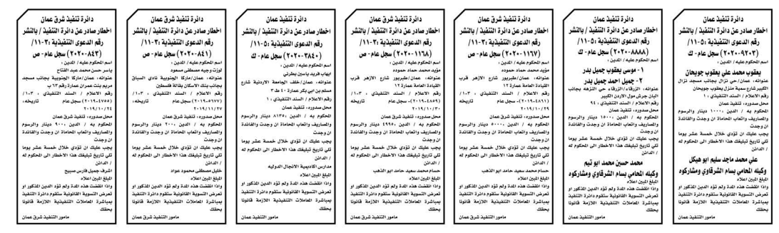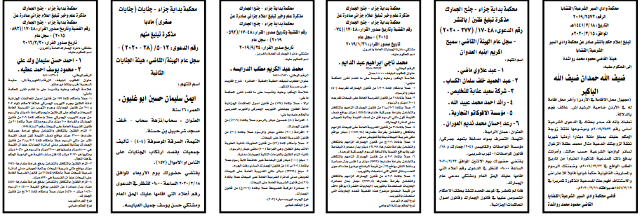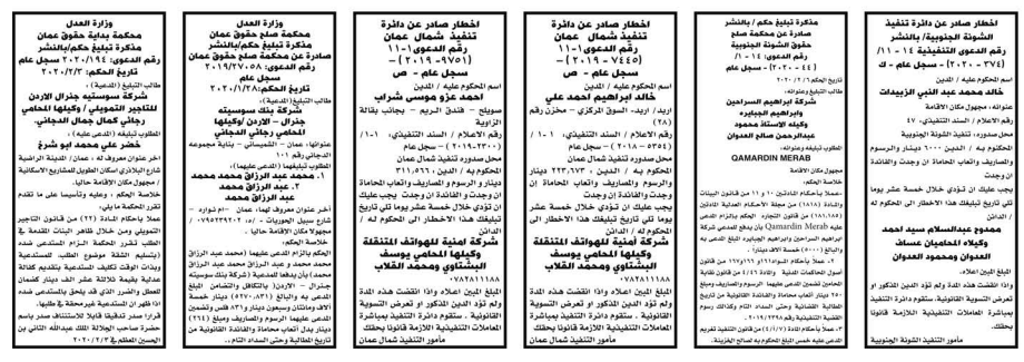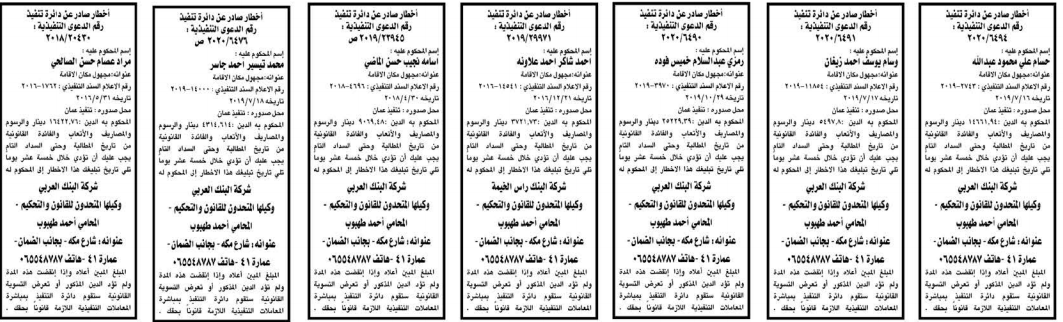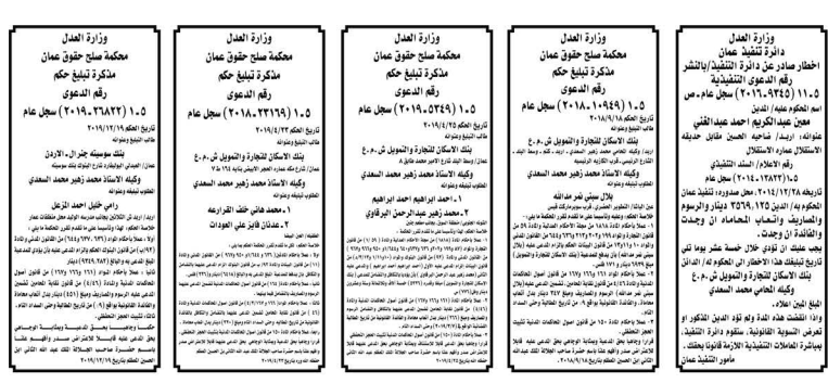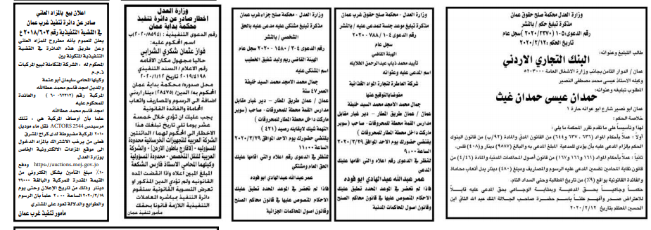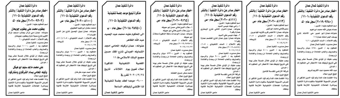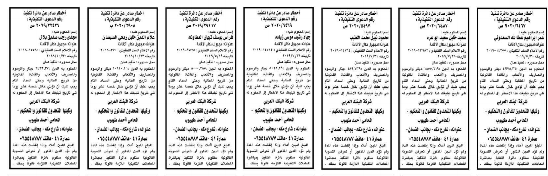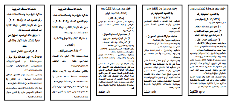 وتضمنت مذكرات بعض الاحكام الصادرة غيابياً إضافة إلى إخطارات وإشعارات صادرة عن دوائر التنفيذ بحق مدعى عليهم أشخاص كانوا أم شركات.