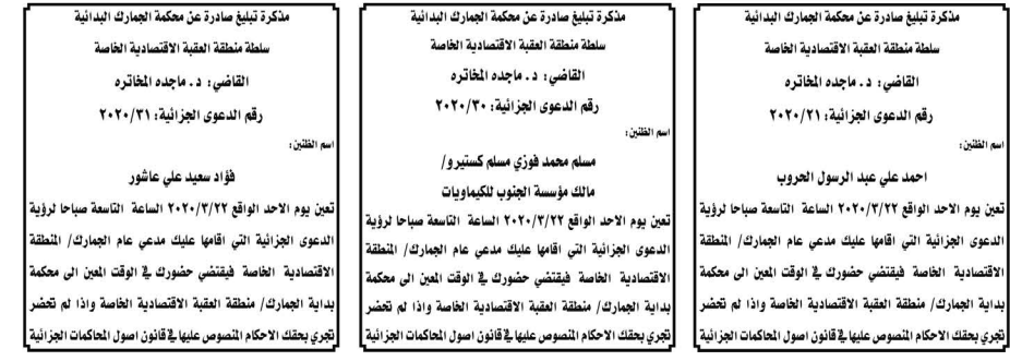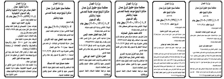 أعلنت وزارة العدل اليوم الثلاثاء عن مذكرات تبليغ مواعيد جلسات المحاكمة للمدعى عليهم بقضايا مختلفة عن طريق المحاكم.