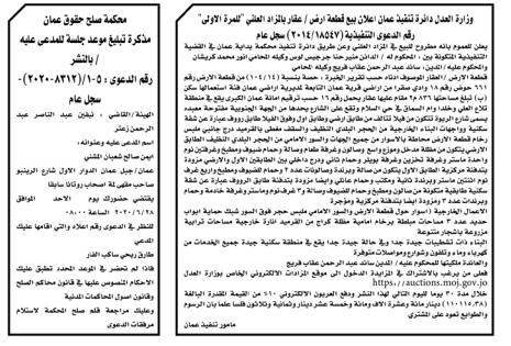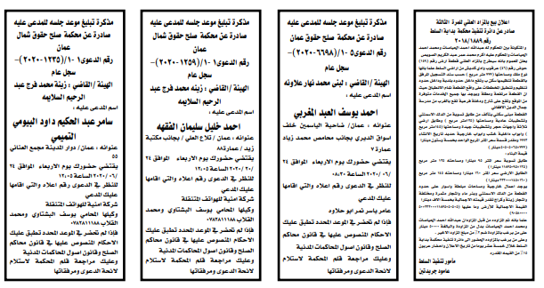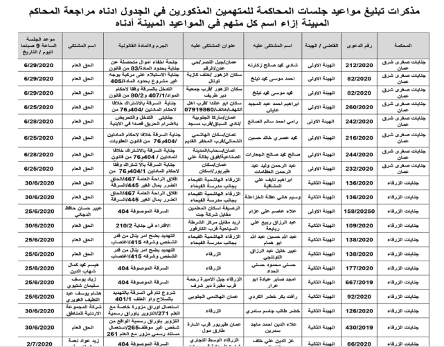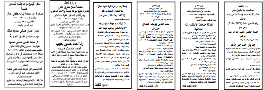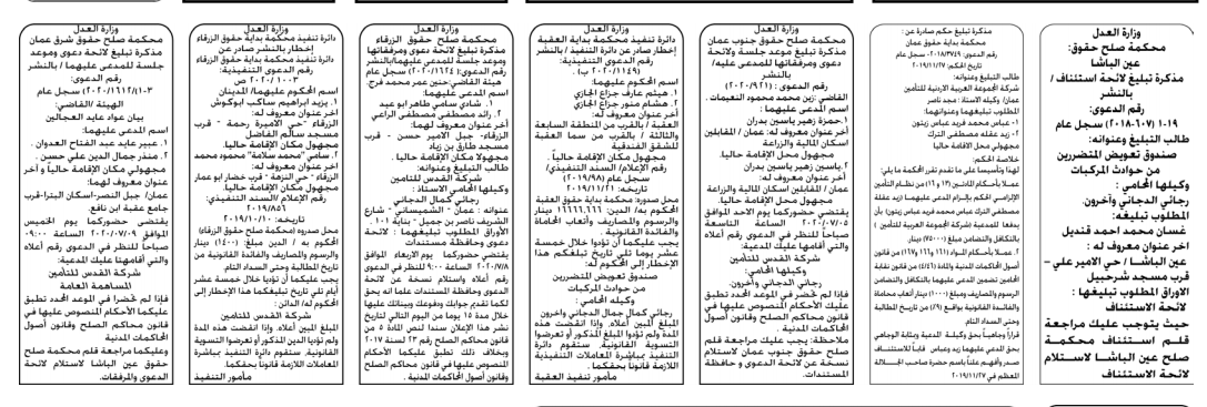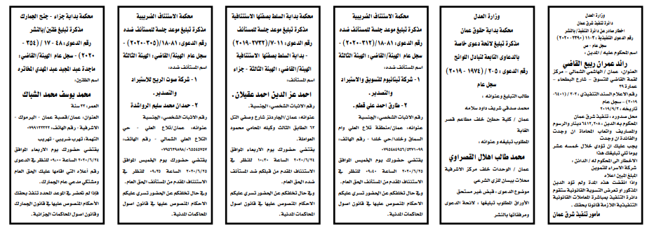 هرمنا – أعلنت وزارة العدل اليوم الثلاثاء عن مذكرات تبليغ مواعيد جلسات المحاكمة للمدعى عليهم بقضايا مختلفة عن طريق المحاكم.