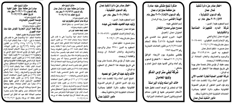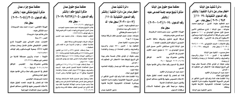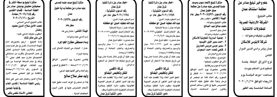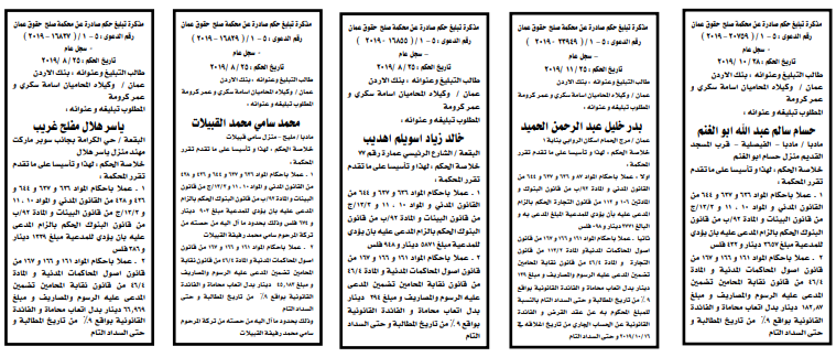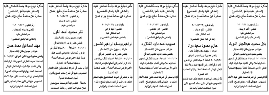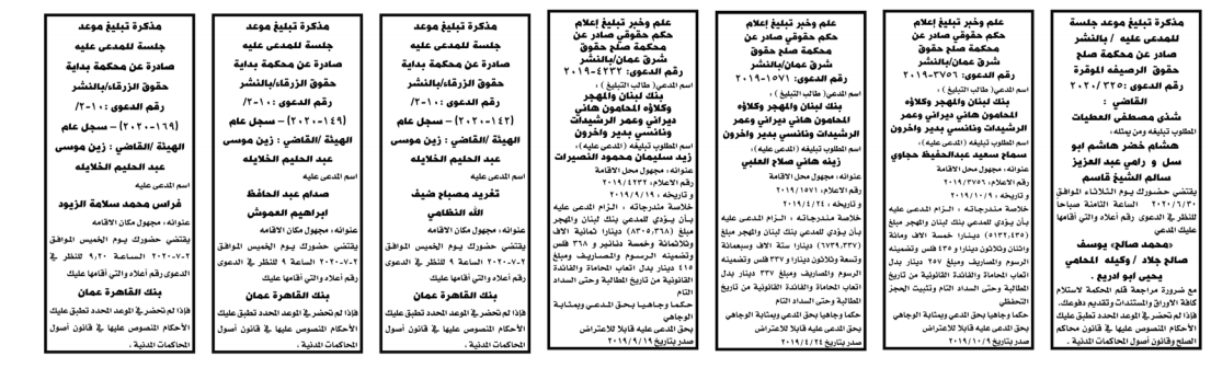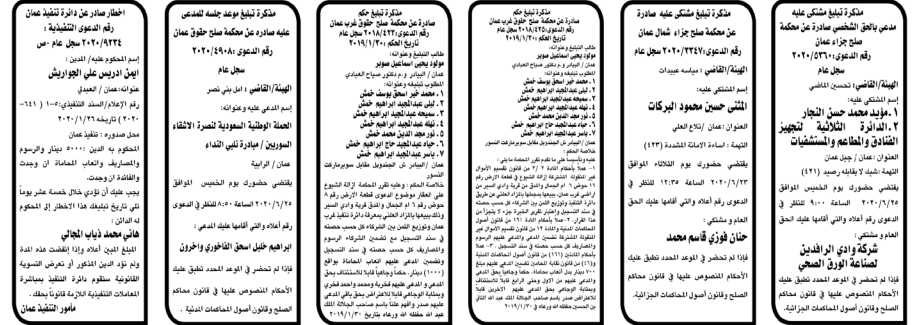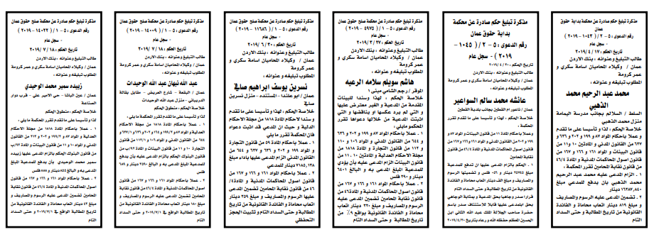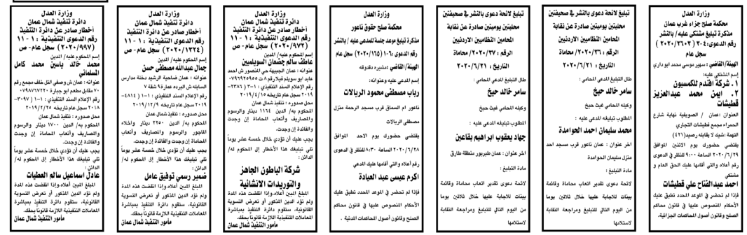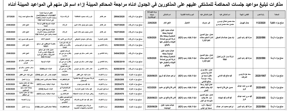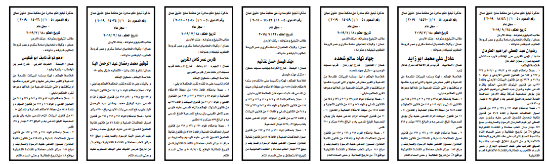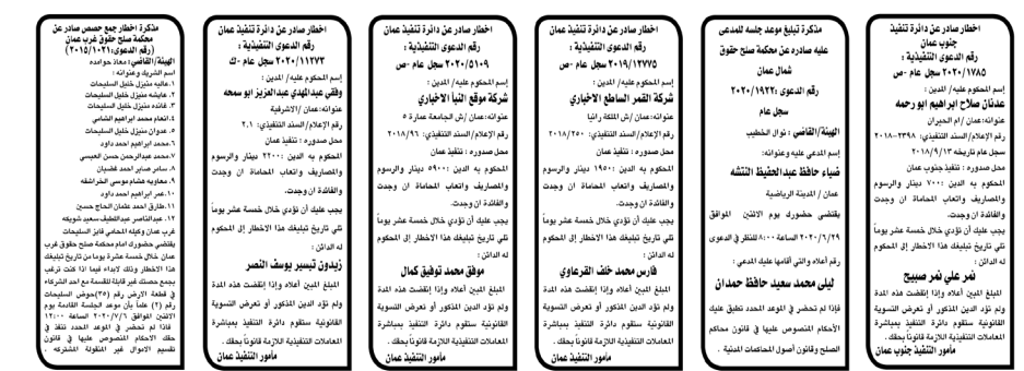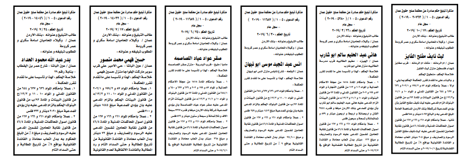 وتضمنت مذكرات الطلب بعض الاحكام الصادرة غيابياً إضافة إلى إخطارات وإشعارات صادرة عن دوائر التنفيذ بحق مدعى عليهم أشخاص كانوا أم شركات. اسماء