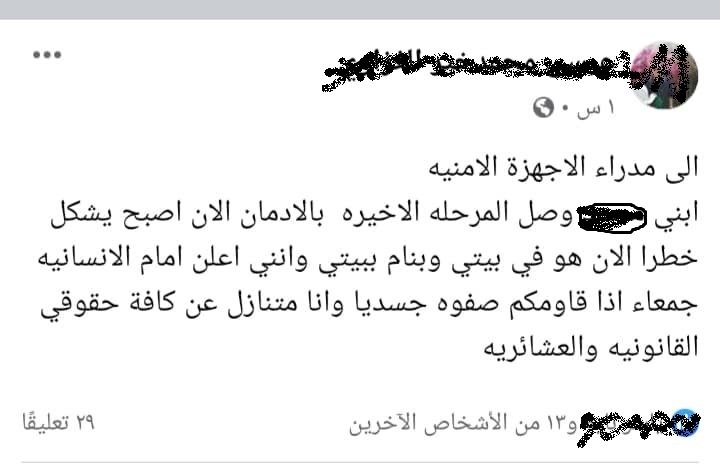 وكتب في منشوره “ابني محمد وصل المرحلة الأخيرة بالإدمان الآن، أصبح يشكل خطرا الآن هو في بيتي وبنام ببيتي وإنني أعلن أمام الإنسانية جمعاء، إذا قاومكم صفوه جسديا”