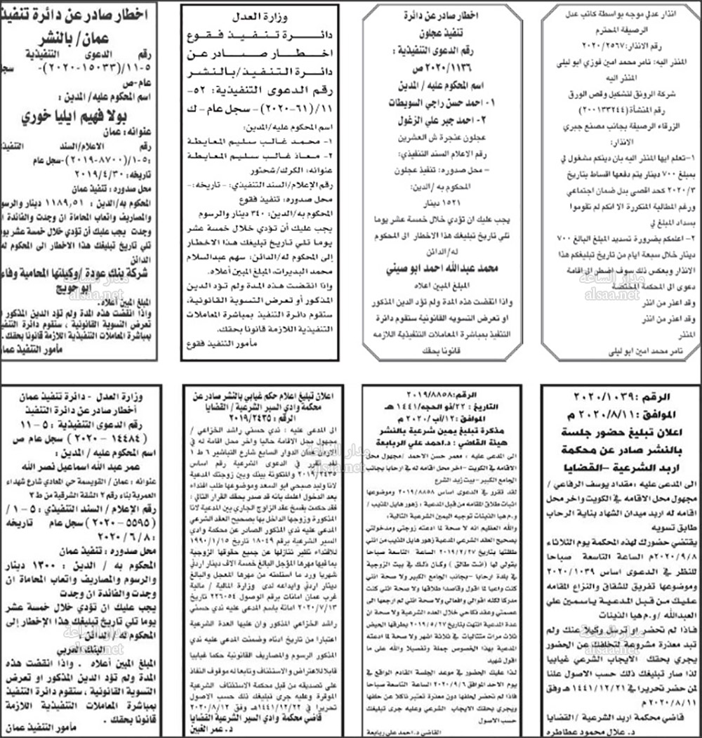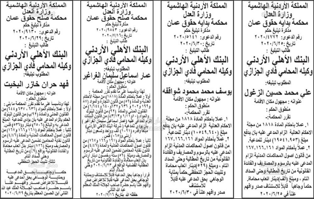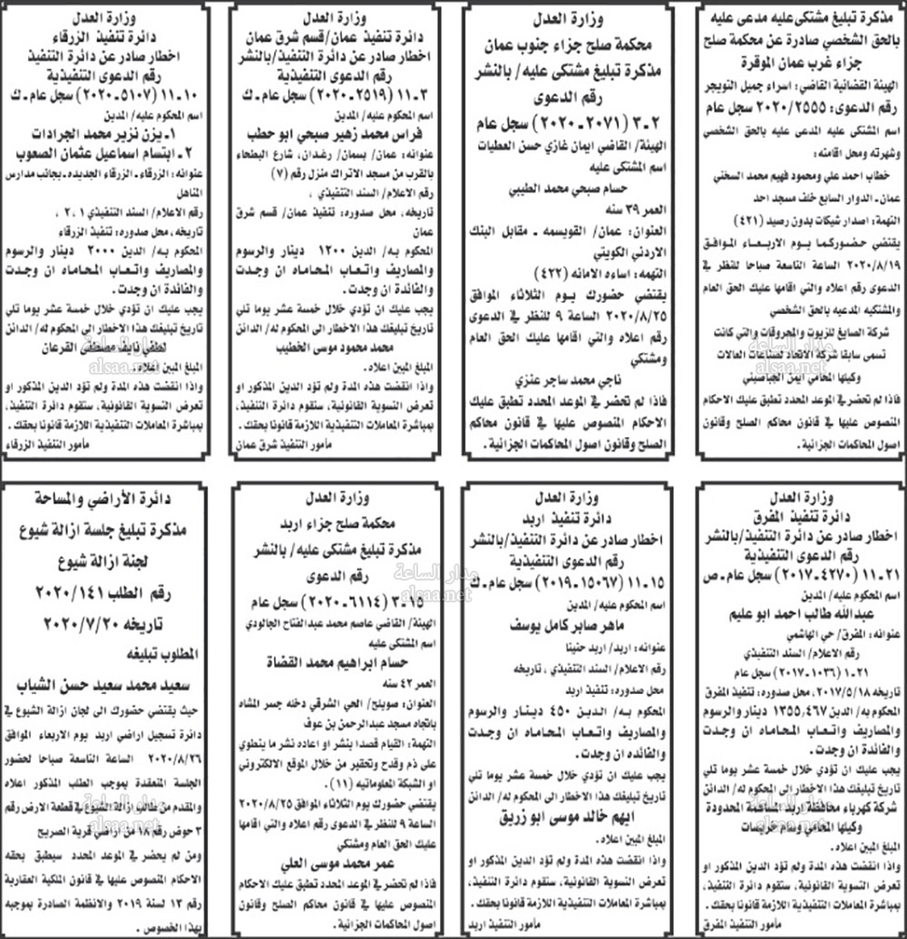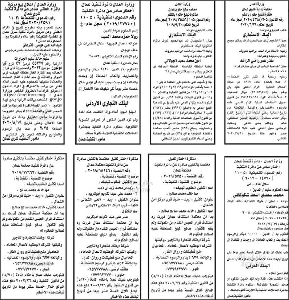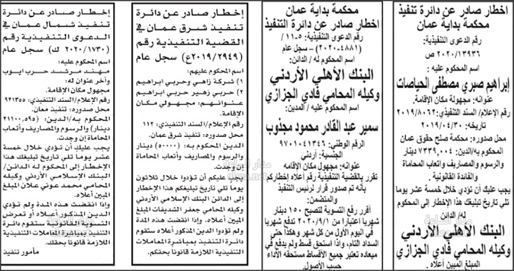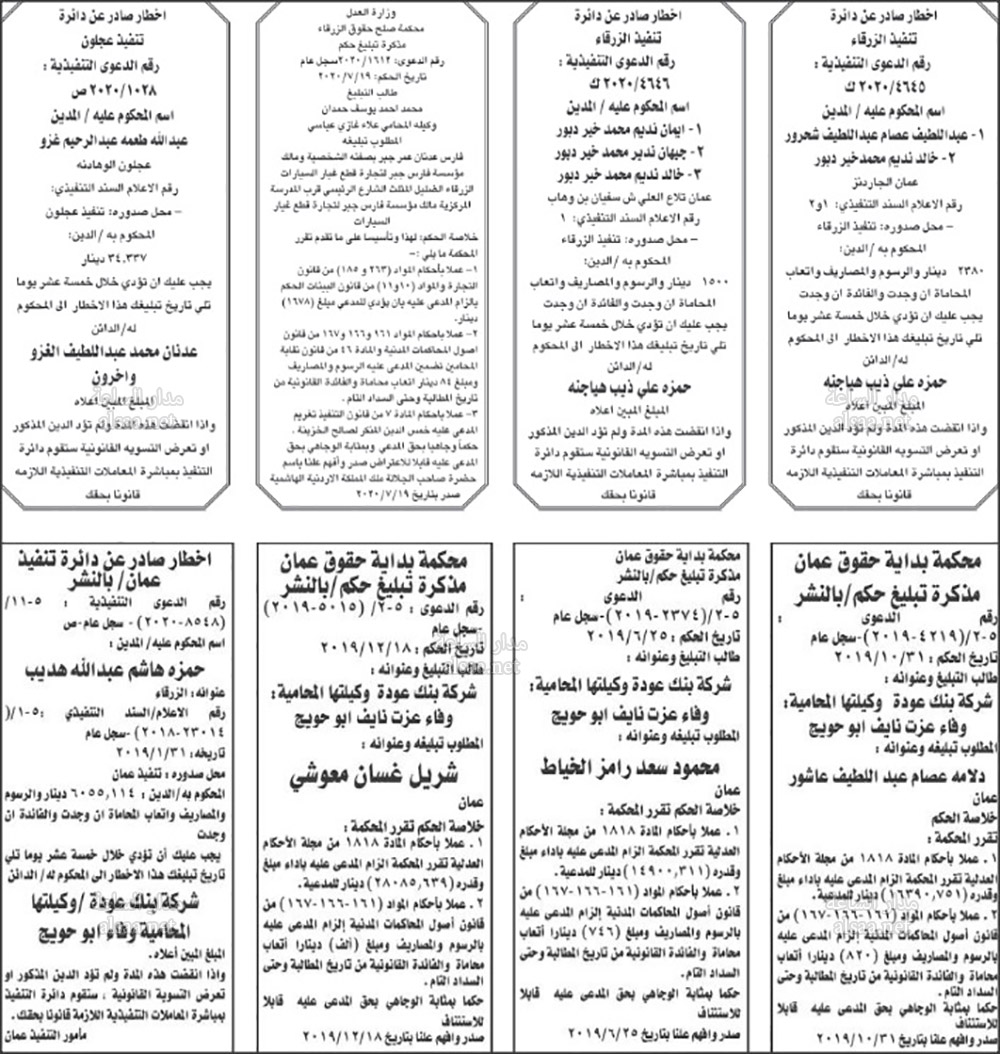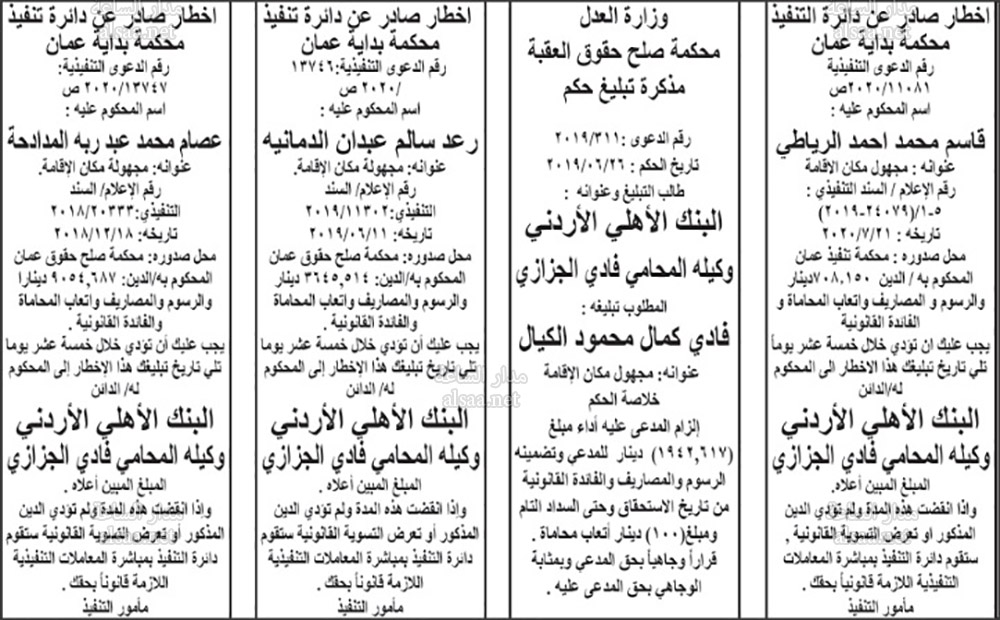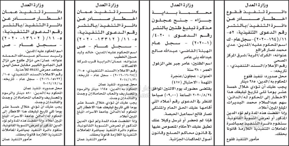 تنفيذ قضائي وإنذارات ومذكرات تبليغ حضور جلسات محاكمة لأردنيين (أسماء)