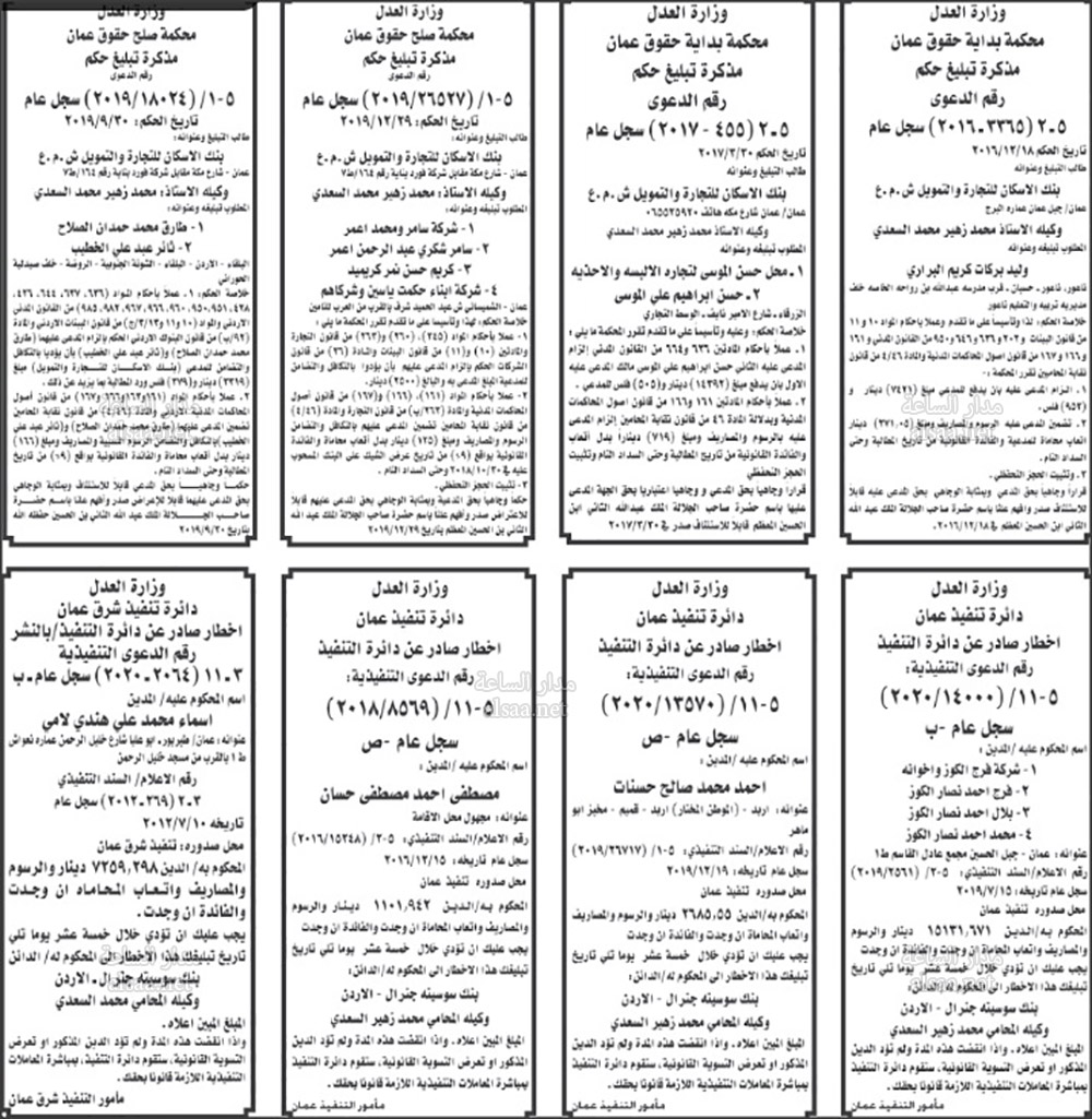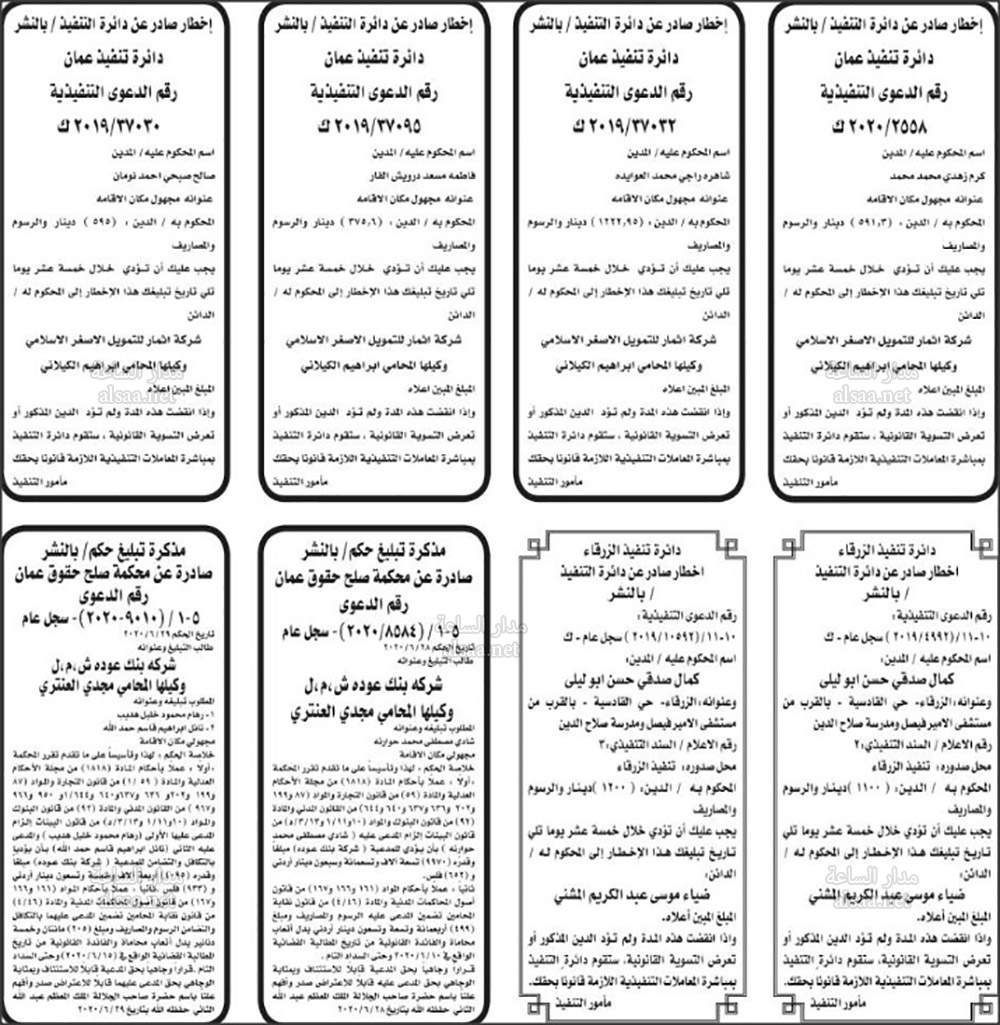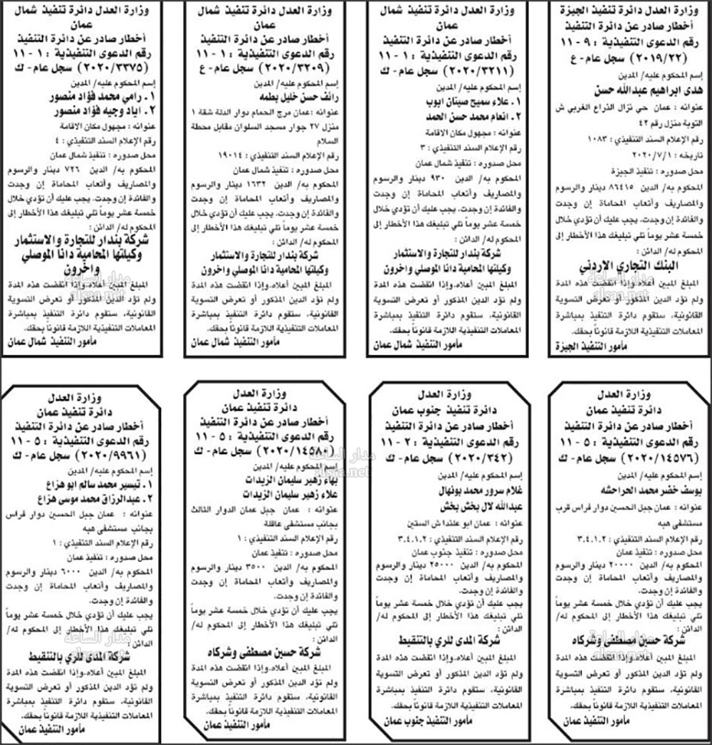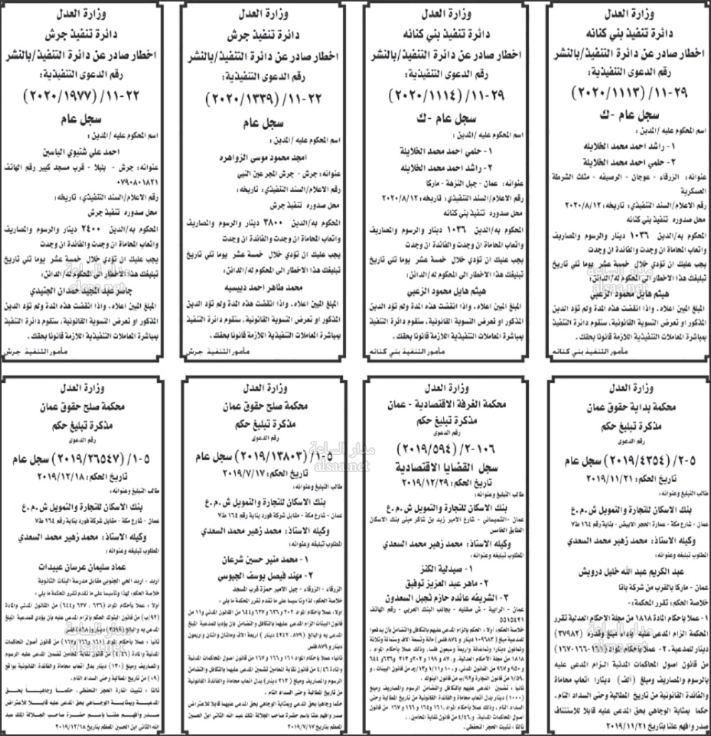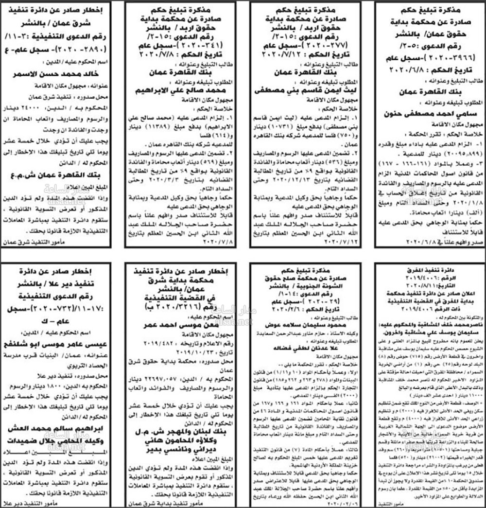 تنفيذ قضائي وإنذارات ومذكرات تبليغ حضور جلسات محاكمة لأردنيين (أسماء)
