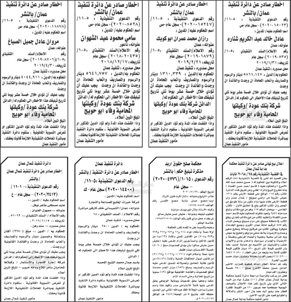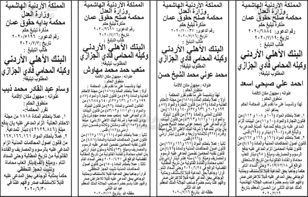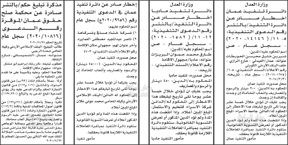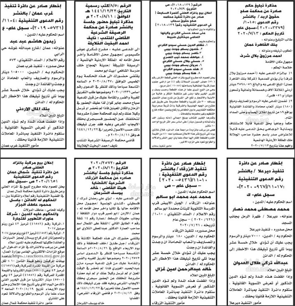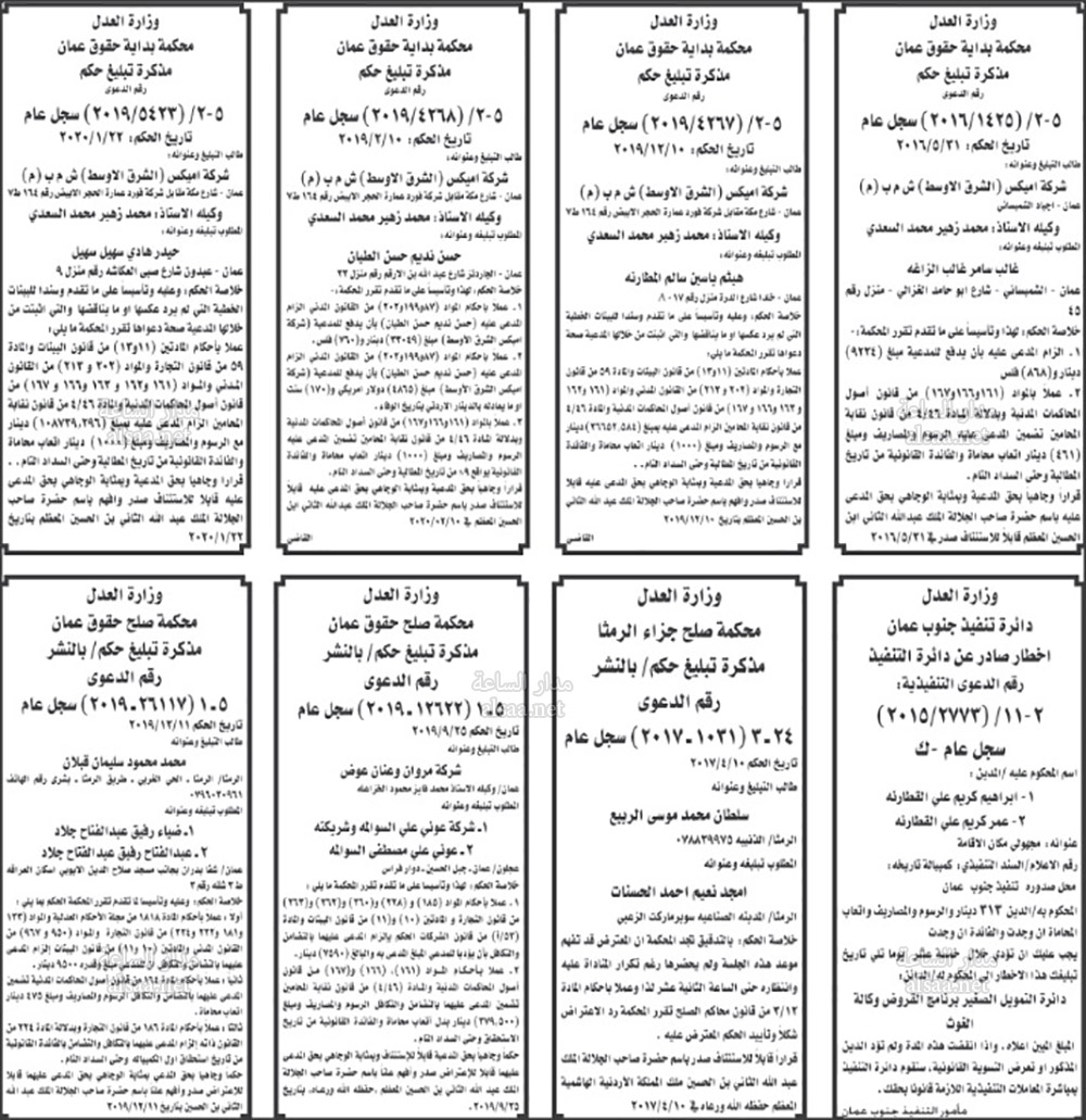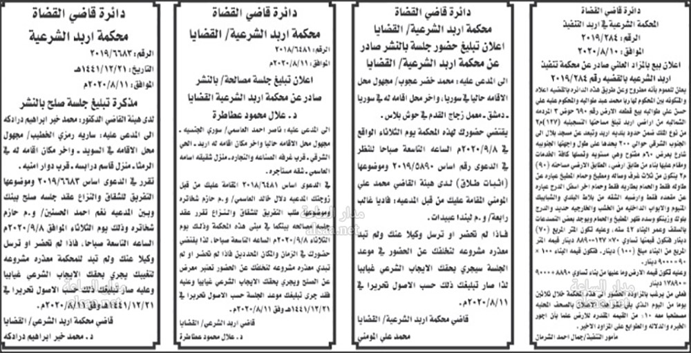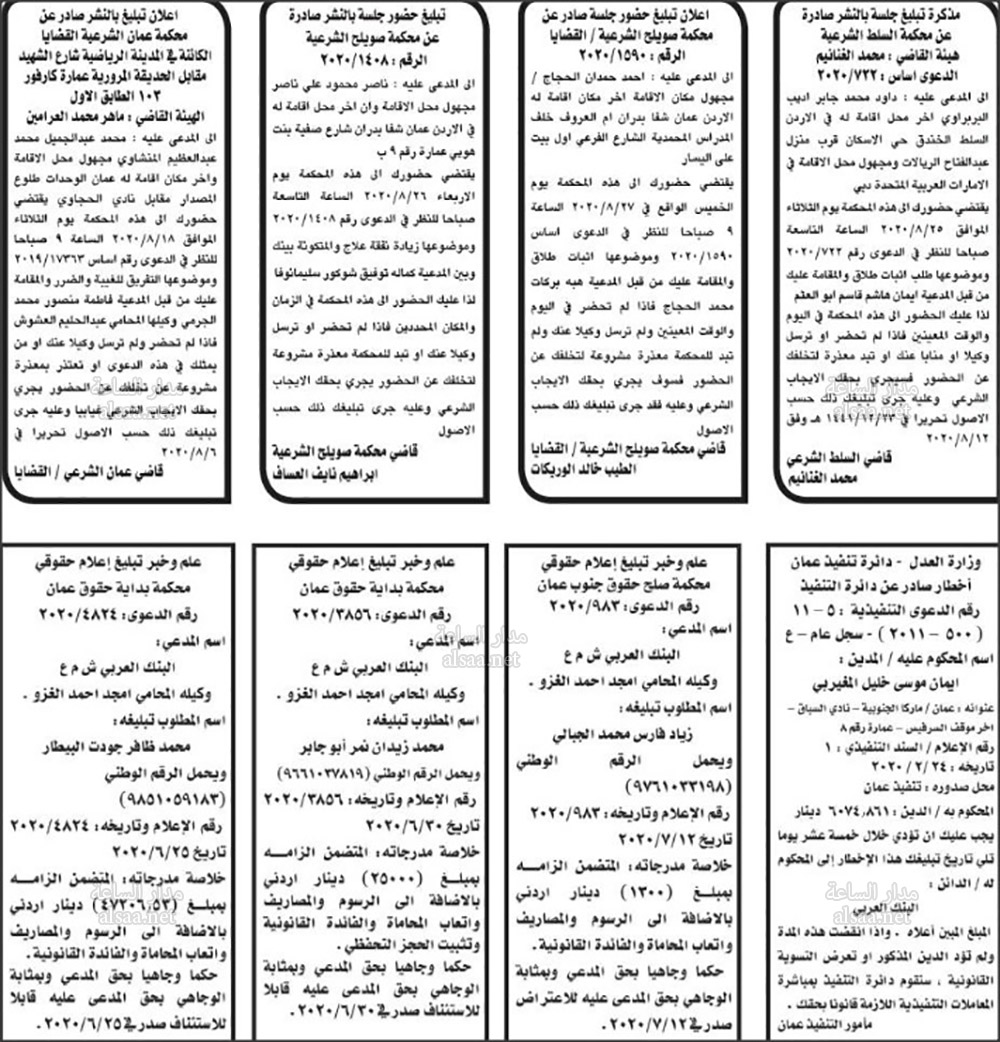 تنفيذ قضائي وإنذارات ومذكرات تبليغ حضور جلسات محاكمة لأردنيين (أسماء)