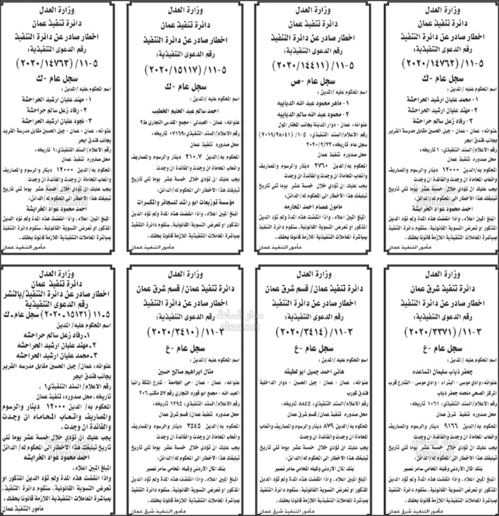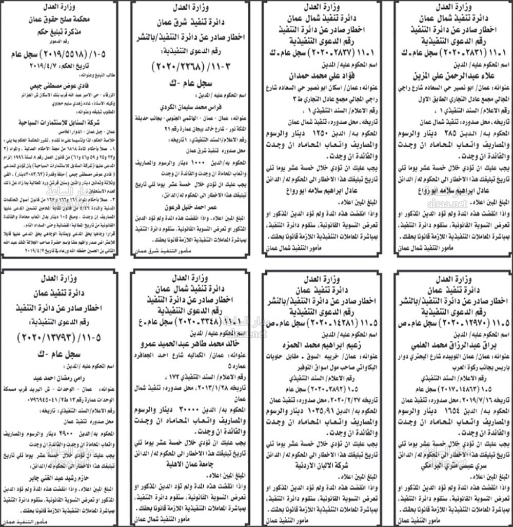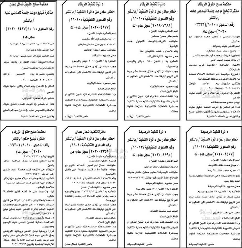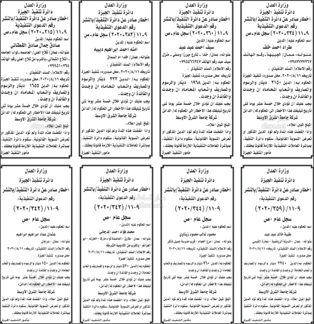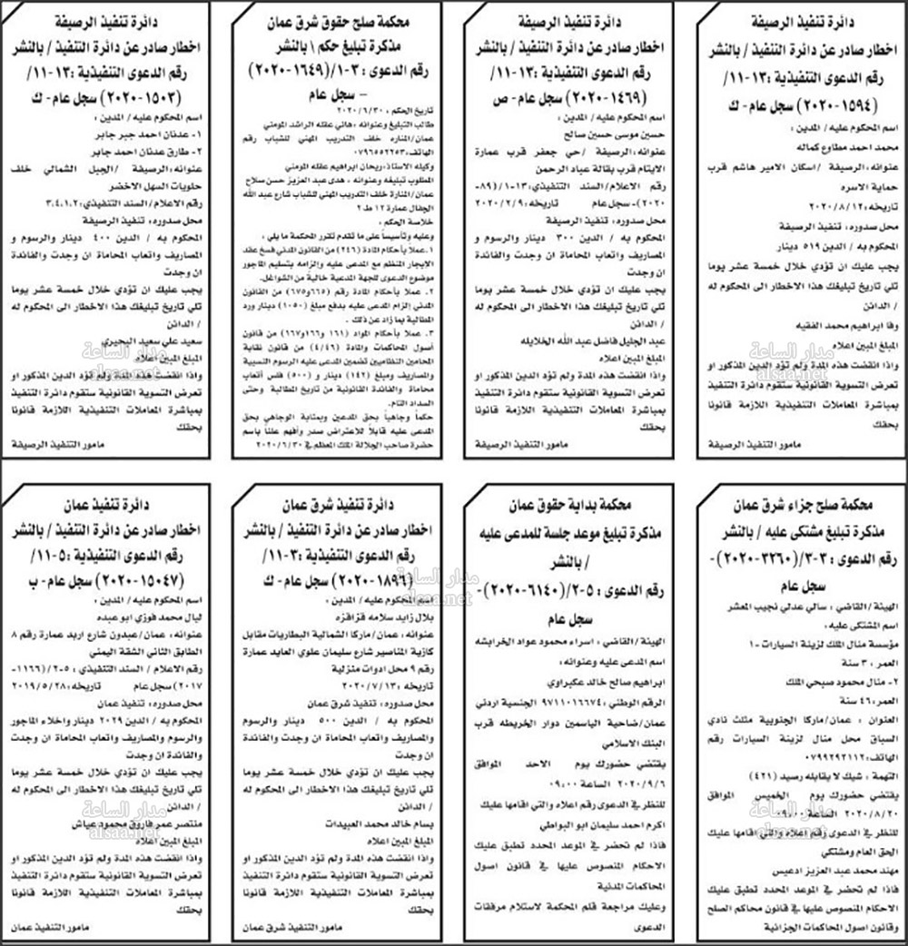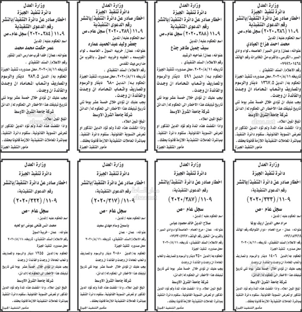 تنفيذ قضائي وإنذارات ومذكرات تبليغ حضور جلسات محاكمة لأردنيين (أسماء)