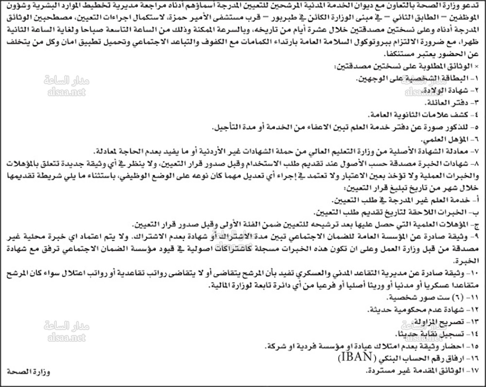 هرمنا – دعت وزارة الصحة بالتعاون مع ديوان الخدمة المدنية اليوم الثلاثاء المرشحين للتعيين المدرجة اسماؤهم لاستكمال اجراءات التعيين وبالسرعة الممكنة.
