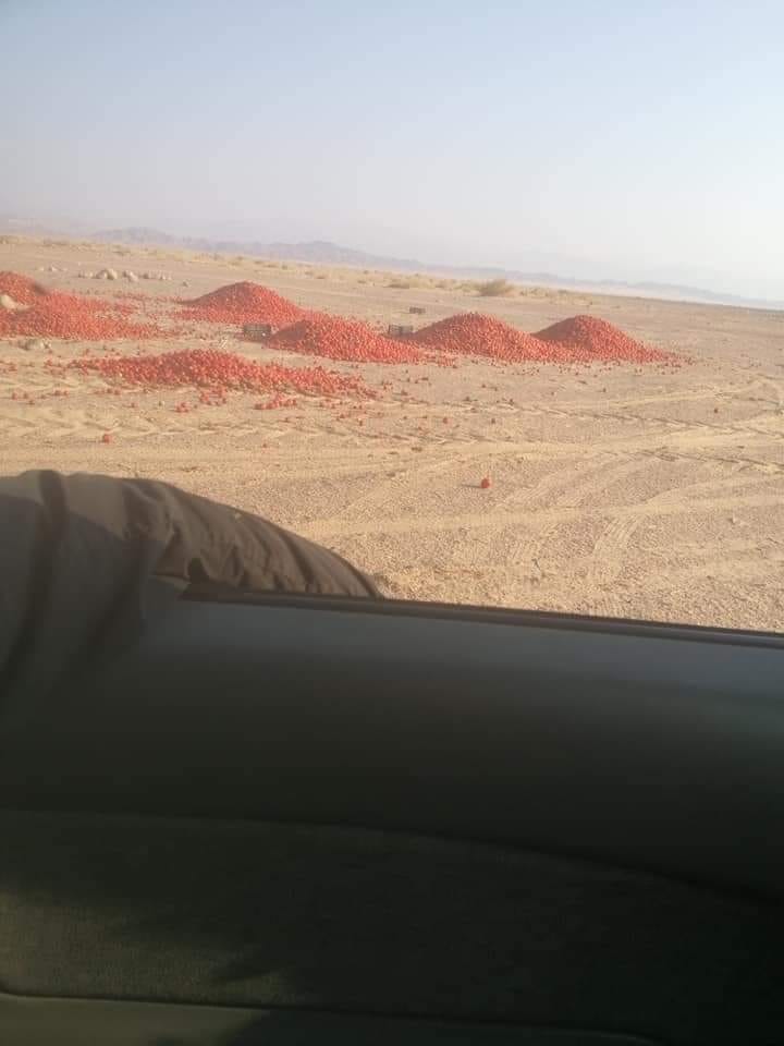 هرمنا – أقدم مزارعون على رمي محاصيل البندورة في الصحراء، احتجاجاً على تدني أسعارها بشكل كبير، بصورة لا تغطي النفقات اللازمة لإنتاج المحصول.