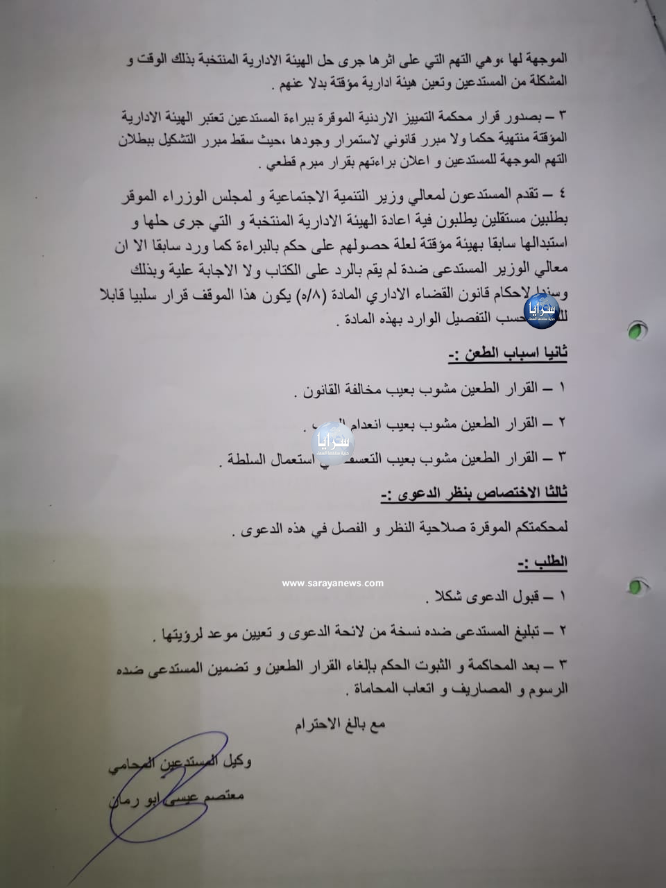 وأشار المستدعون في طلب الطعن الذي قدمه وكيل الدفاع عنهم المحامي معتصم أبو رمان، وهم كل من النائب أيوب خميس، ومحمد مكي وكاظم عايش وتيسير ظاهر وصبحي أبو شندي وعبد الكريم نصر الله إلى قرار محكمة التمييز ببراءتهم لتأكيد قرارات سابقة من القضاء وهيئة مكافحة الفساد حول هذا البراءة من التهم التي تم على أثرها حل الهيئة الإدارية للجمعية عام 2006، وتعيين هيئة إدارية مؤقتة للجمعية، مؤكدين أن استمرار عمل الهيئة الإدارية المؤقتة مخالف للقانون لسقوط السبب الذي تم بموجبه تشكيل هذه الهيئة، وحل الهيئة الإدارية السابقة.