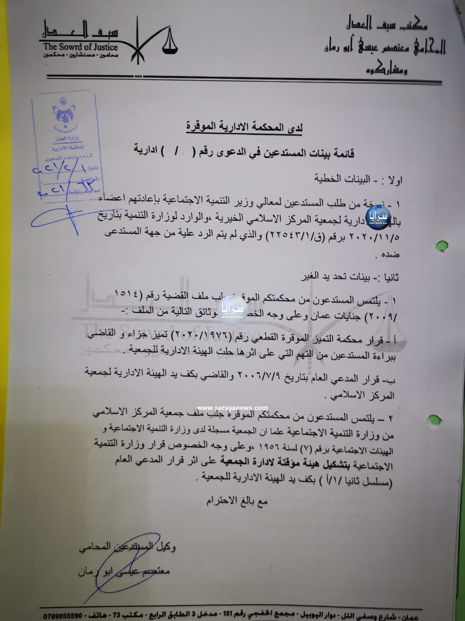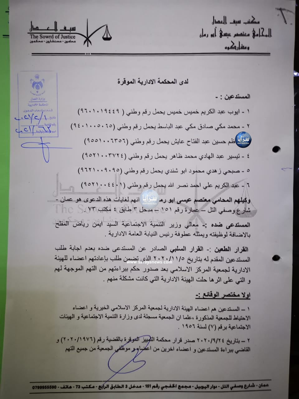 هرمنا – تقدم أعضاء من الهيئة الإدارية السابقة المنتخبة لجمعية المركز الإسلامي والتي تم حلها عام 2006 بقرار من وزارة التنمية الاجتماعية، بطعن لدى المحكمة الإدارية حول قرار وزير التنمية الاجتماعية أيمن المفلح بعدم إعادة عضويتهم للهيئة الإدارية رغم صدور قرار قضائي قطعي ببراءتهم من التهم الموجهة ضدهم آنذاك، معتبرين قرار الوزير مخالفا للقانون وتعسفاً في استعمال السلطة.