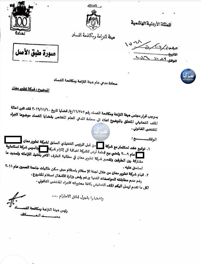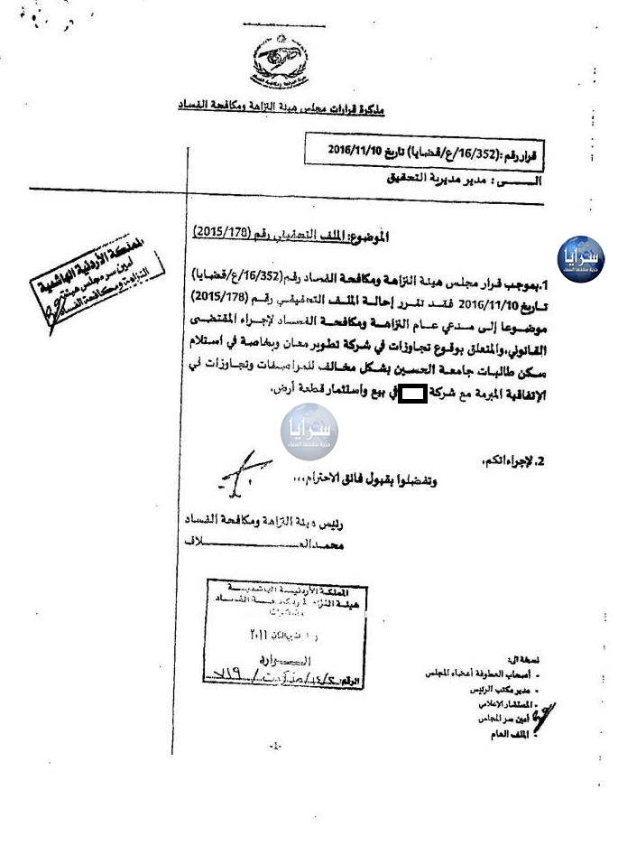 ولفتت لضرورة الكشف عن مصير ملف سكن الطالبات ضمن المجمع السكني قبالة جامعة الحسين والمحال من قبل هيئة النزاهة والفساد الى مدعي عام الهيئة في الثالث من تشرين ثاني/ ديسمبر 2016 ، إلى جانب اتفاقية أبرمتها الشركة قبل سنوات مع احد الشركات الاستثمارية لثبوت تجاوزات ومخالفات.