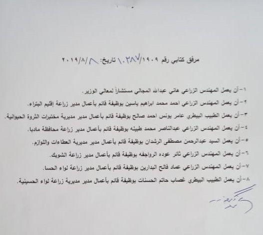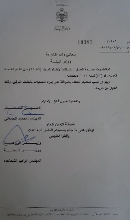 قرر وزير الزراعة ووزير البيئة المهندس ابراهيم الشحاحدة وبناء على تنسيب الامين العام اجراء تشكيلات ادارية اعتبار من تاريخ 8/8/2019.وشملت التشكيلات تعيين مستشار للوزير وعدد من مدراء الزراعة في المحافظات ومدير عطاءات على النحو التالي: