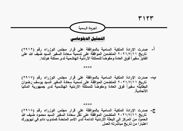 كما صدرت الارادة الملكية السامية بالموافقة على قرار مجلس الوزراء المتضمن تسمية السفير يوسف رضوان البطاينة سفيراً فوق العادة ومفوضاً للمملكة الأردنية الهاشمية لدى جمهورية ألمانيا الاتحادية. وصدرت الارادة الملكية السامية بالموافقة على قرار مجلس الوزراء المتضمن الموافقة على نقل السفير محمود ضيف الله الحمود من المركز إلى البعثة الأردنية الدائمة لدى الأمم المتحدة كمندوب دائم في نيويورك.