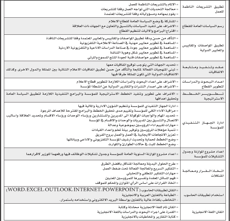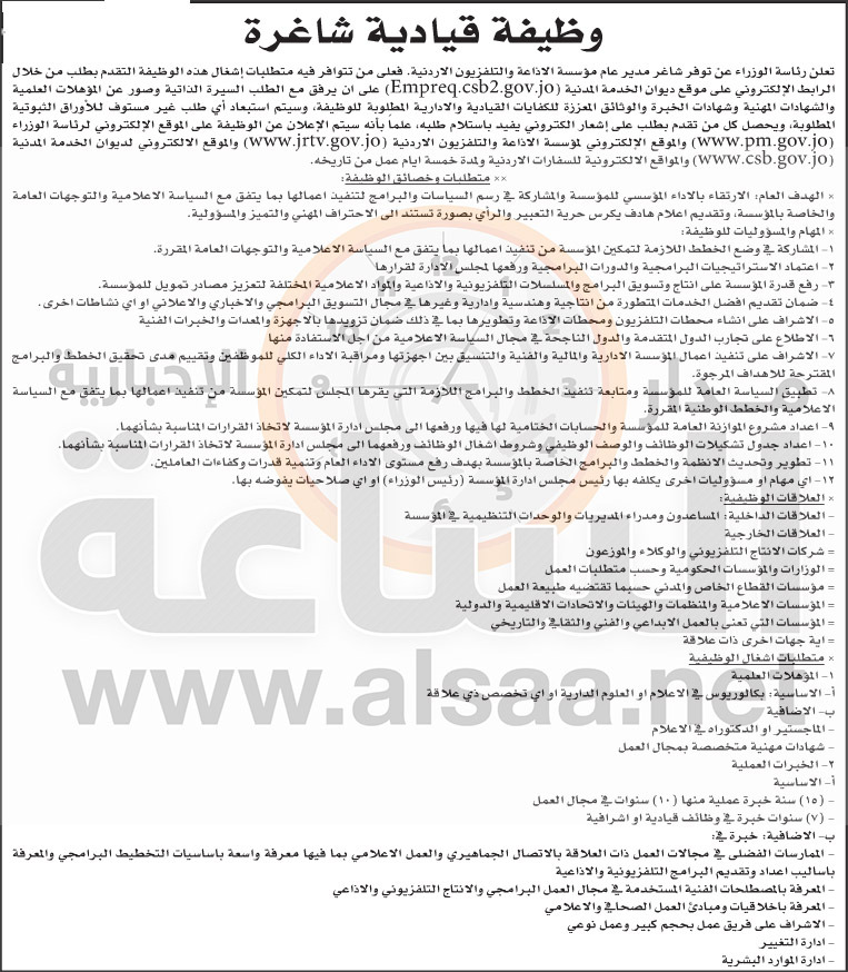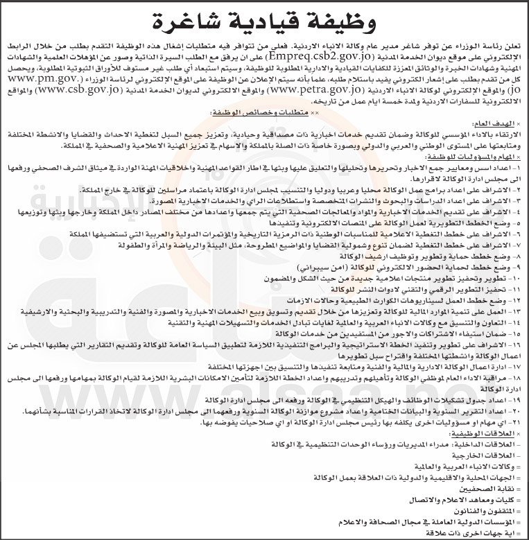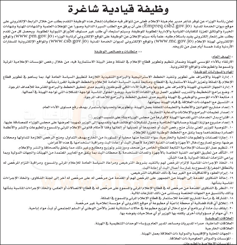 وأعلنت الرئاسة اليوم الاحد عن توافر شاغر مدير عام وكالة الانباء الأردنية، ومدير عام هيئة الاعلام، ومدير عام مؤسسة الاذعة والتلفزيون الأردنية.