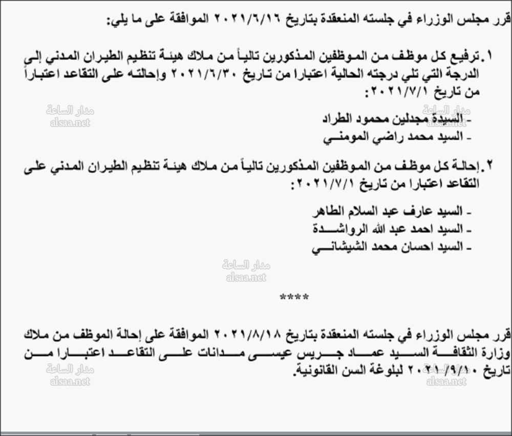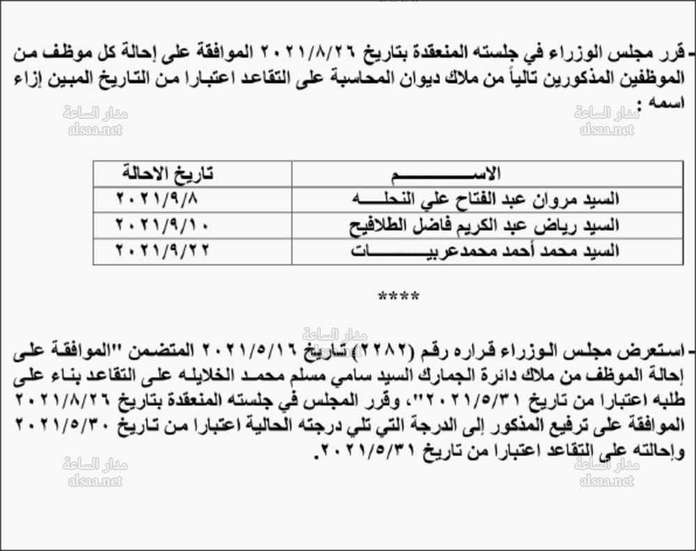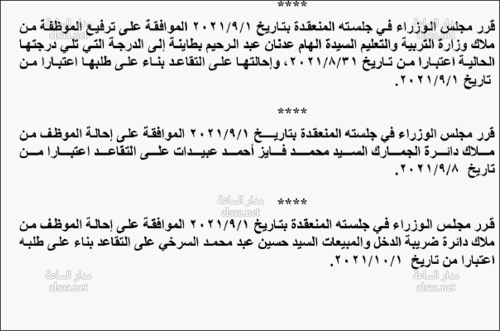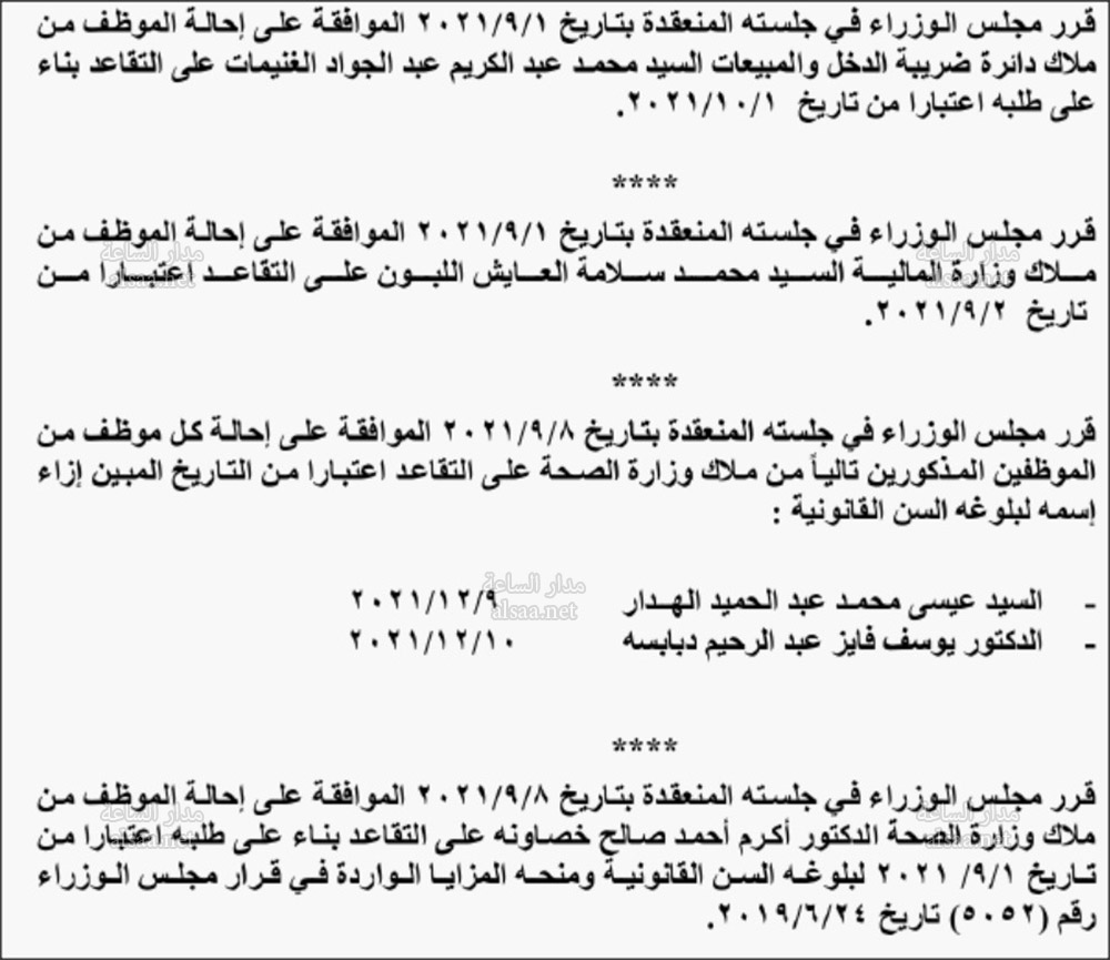 هرمنا - قرر مجلس الوزراء إحالة موظفين في عدد من الوزارات والدوائر إلى التقاعد.وتاليا الاسماء: