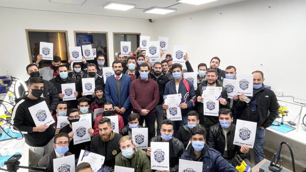 هرمنا – تحت رعاية أمين عام الوكالة الإنمائية للتعاون الدولي وبحضور المهندس عدي العتال مؤسس الأكاديمية ومدير قسم التدريب والمهندس خالد الصغير مدير قسم الدورات المتقدمة والمهندس قيس الخوالدة مدير قسم تطوير المختبرات والضيوف والطلبة الكرام أقامت اكاديمية الهاتف الذكي حفلا لتخريج طلبتها وابتدا الحفل بكلمه ترحيبه من مؤسس الأكاديمية رحب فيها براعي الحفل والحضور الكريم وتحدث في الحفل المهندس خالد والمهندس قيس ، كان من أهمّ ما قيل فيها أن أبواب الأكاديمية مفتوحة مجاناً لطلابها حتى بعد التخرج لمن يرغب في إعادة الدورة مجاناً أو تطوير نفسه أو فتح مشروع أو حتى للتطبيق العملي المكثف وفي نهايه الحفل قام الراعي بتسليم الشهادات للطلاب وتشكر الأكاديمية هيئة تنميةوتطوير المهارات المهنية والتقنية والموظفين على دعمهم المستمر لقطاع التدريب والتعليم المهني والتقني وتخص بالذكر