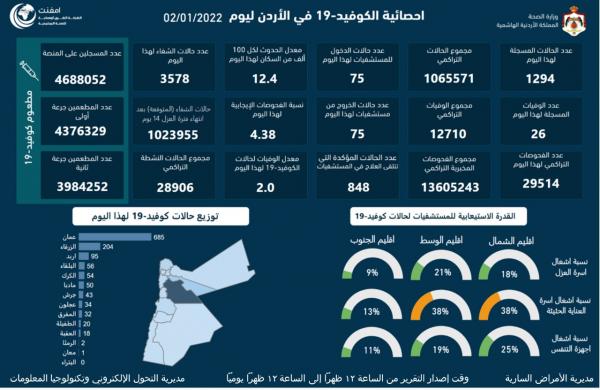 و تمّ إجراء (29514) فحصاً مخبريّاً، ليصبح إجمالي عدد الفحوصات (13605243) فحصاً ، كما بلغ عدد حالات الشفاء لهذا اليوم (3578) حالة، ليصل إجمالي حالات الشفاء إلى (1023955) حالة ، فيما بلغ عدد الحالات النشطة حاليّا (28906) حالة.