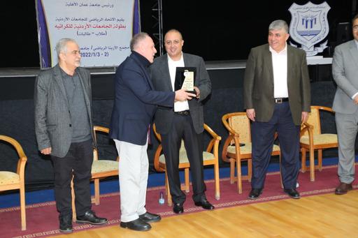 وفي ختام منافسات البطولة قام الدكتور ماهر الحوراني بتقديم درع تذكارية للسيد مازن القطب رئيس الاتحاد الأردني للكراتيه تقديراً لدعمهم لأنشطة وبطولات الاتحاد الرياضي للجامعات الأردنية.