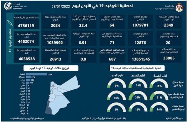 هرمنا - أعلنت وزارة الصحة، اليوم الاحد، عن تسجيل 20 وفاة و2349 إصابة كورونا جديدة في الأردن.