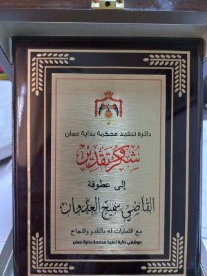 القاضي سميح بيك العدوان يستعد للإنطلاق من جديد إلى الجناح الآخر من العدالة وهي مهنة المحاماه التي ستكون متلازمة معه في باقي العمر الطويل والتوفيق من الله دوماُ ولكن المكتوب يقرأ من الحرف الأول في بداية السطر فمن يملك خلق وطُهر وكرامة وثقافة ومعرفة وابتسامة واحترام للآخرين سينجح بالطبع بصرف النظر عن المهنة التي سيعمل بها فكيف ولو كان هذا الشخص بأخلاق ابن العدوان سميح بيك الذي كان مجسداً لقوله تعالى : “في إحقاق الحق ان حكمتم بين الناس أن تحكموا بالعدل” ومتّبعاً سنة الرسول الكريم الذي قال ” عدل ساعة خير من عبادة ستين سنة ” وهنا نقول للقاضي سميح العدوان لقد خسرك القضاء وكسبتك مهنة المحاماة أما الناس والمحبين فلم يخسروا شيئاً فعندما كانوا أمامك نالوا عدلهم والآن سينشدونك للدفاع عنهم وهنيئاً لمن يكرم في حياته ونقصد هنا موظفي دائرة التنفيذ في محكمة بداية عمّان الذين وجهوا درع شكر وتقدير إلى عطوفة القاضي العادل متمنين له التقدم والنجاح في سيرته ومسيرته المستقبلية والله يعطيك العافية.