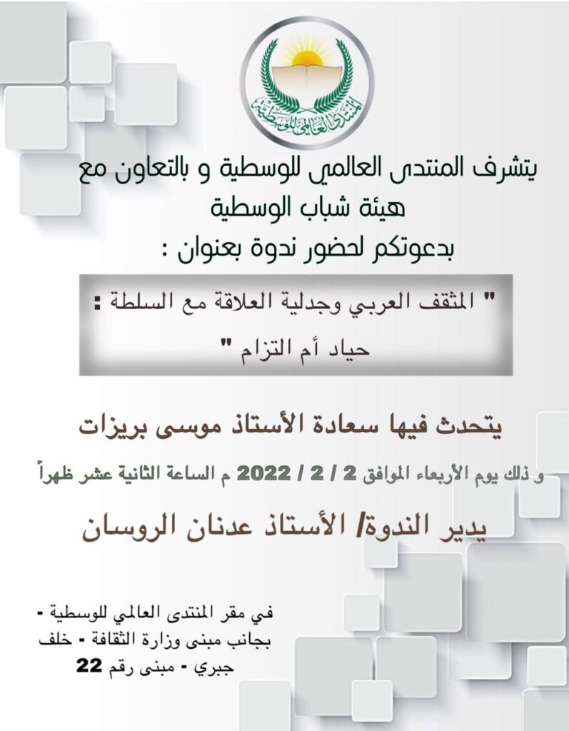 هرمنا – يتشرف المنتدى العالمي للوسطيه وبالتعاون مع هيئة الوسطيه دعوتكم لحظور ندوه بعنوان ” المثقف العربي وجدلية العلاقه مع السلطة حيادة ام التزام ” يلقيها