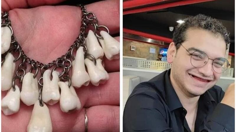 وبالبحث تبين بأن القصة غير حقيقية، والصور المنتشرة قديمة نشرها طبيب أسنان قبل أكثر من 3 سنوات وهي لقلادة من الأسنان غير حقيقية.