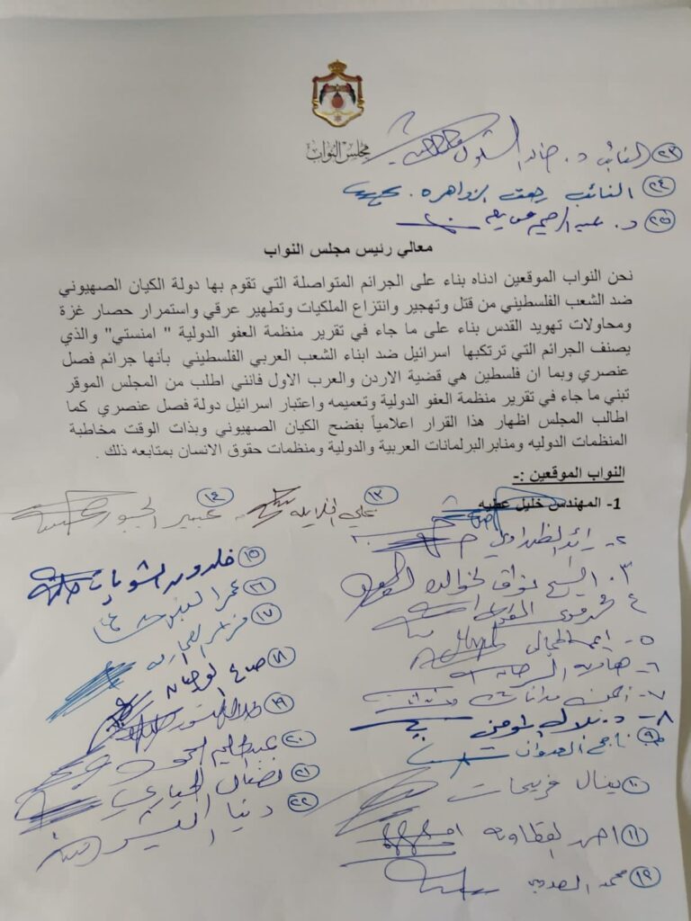 نحن النواب الموقعين ادناه بناء على الجرائم المتواصلة التي تقوم بها دولة الكيان الصهيوني ضد الشعب الفلسطيني من قتل وتهجير وانتزاع الملكيات وتطهير عرقي واستمرار حصار غزة ومحاولات تهويد القدس بناء على ما جاء في تقرير منظمة العفو الدولية ” امنستي” والذي يصنف الجرائم التي ترتكبها اسرائيل ضد ابناء الشعب العربي الفلسطيني بأنها جرائم فصل عنصري وبما ان فلسطين هي قضية الاردن والعرب الاول فانني اطلب من المجلس الموقر تبني ما جاء في تقرير منظمة العفو الدولية وتعميمه واعتبار اسرائيل دولة فصل عنصري كما اطالب المجلس اظهار هذا القرار اعلامياً بفضح الكيان الصهيوني وبذات الوقت مخاطبة المنظمات الدوليه ومنابرالبرلمانات العربية والدولية ومنظمات حقوق الانسان بمتابعه ذلك .